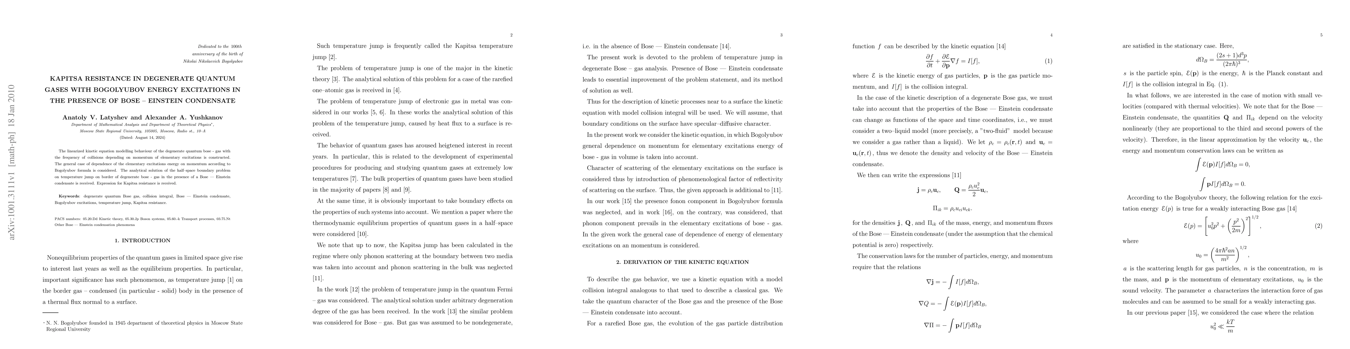 This paper constructs a linearized kinetic equation for degenerate quantum bose gas, focusing on Bogolyubov energy excitations and the presence of Bose-Einstein condensate. It derives an analytical solution for the temperature jump at the boundary, leading to an expression for Kapitsa resistance.