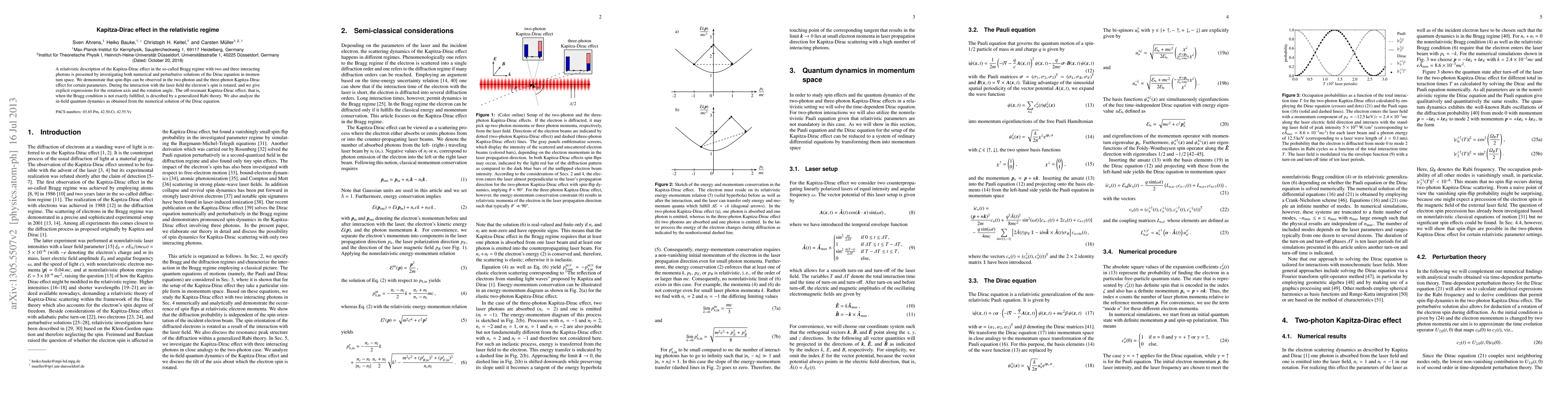 This paper presents a relativistic analysis of the Kapitza-Dirac effect, focusing on two-photon and three-photon interactions, revealing spin-flip phenomena and electron spin rotation in a laser field. It also describes the generalized Rabi theory for the off-resonant effect and provides numerical solutions for in-field quantum dynamics.