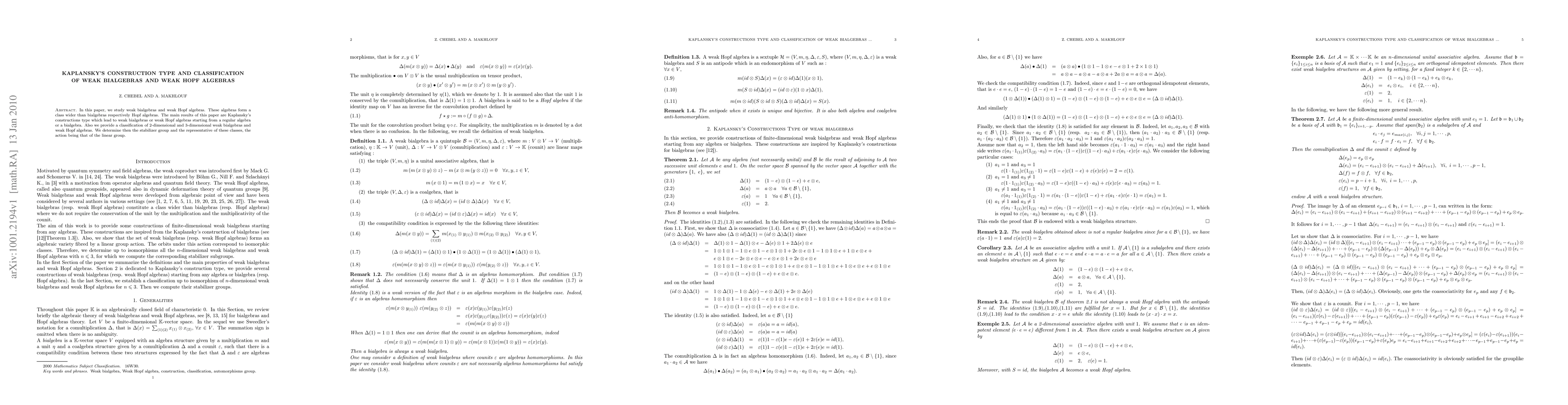 In this paper, we study weak bialgebras and weak Hopf algebras. These algebras form a class wider than bialgebras respectively Hopf algebras. The main results of this paper are Kaplansky's constructions type which lead to weak bialgebras or weak Hopf algebras starting from a regular algebra or a bialgebra. Also we provide a classification of 2-dimensional and 3-dimensional weak bialgebras and weak Hopf algebras. We determine then the stabilizer group and the representative of these classes, the action being that of the linear group.