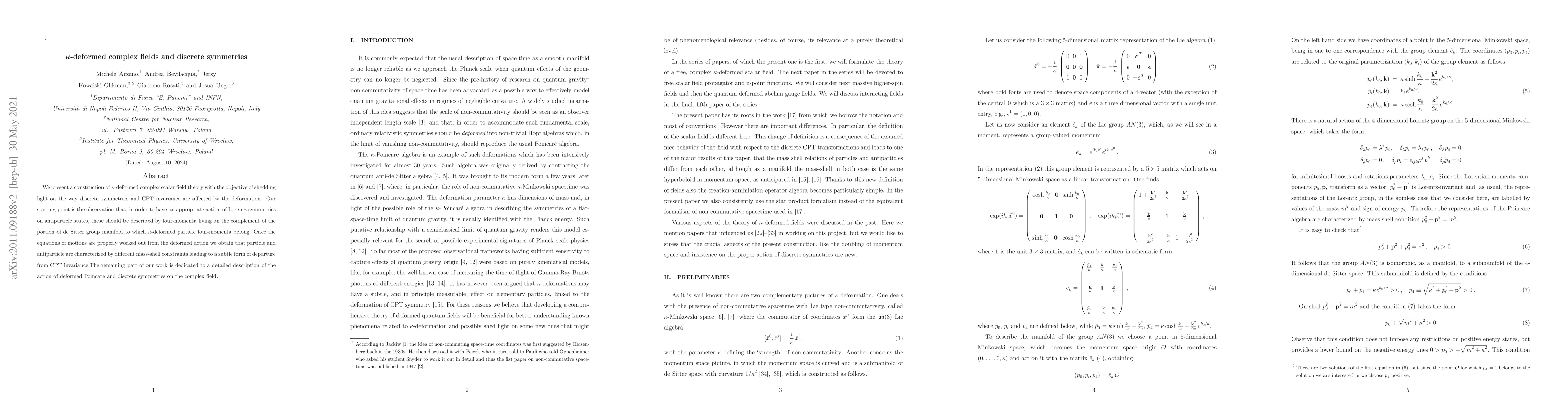 We present a construction of $\kappa$-deformed complex scalar field theory with the objective of shedding light on the way discrete symmetries and CPT invariance are affected by the deformation. Our starting point is the observation that, in order to have an appropriate action of Lorentz symmetries on antiparticle states, these should be described by four-momenta living on the complement of the portion of de Sitter group manifold to which $\kappa$-deformed particle four-momenta belong. Once the equations of motions are properly worked out from the deformed action we obtain that particle and antiparticle are characterized by different mass-shell constraints leading to a subtle form of departure from CPT invariance. The remaining part of our work is dedicated to a detailed description of the action of deformed Poincar\'e and discrete symmetries on the complex field.