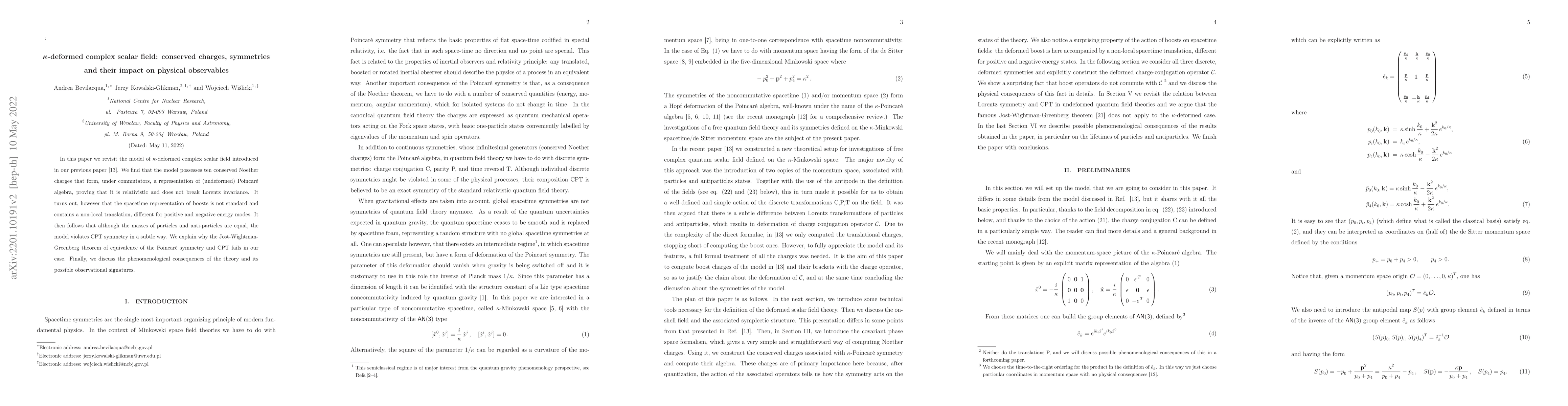In this paper we revisit the model of $\kappa$-deformed complex scalar field. We find that this model possesses ten conserved Noether charges that form, under commutators, a representation of (undeformed) Poincar\'e algebra. It follows that the theory is relativistic and does not break Lorentz invariance. However the spacetime representation of boosts is not standard, and contains a non-local translation, different for positive and negative energy modes. It then follows that although the masses of particles and anti-particles are equal, the theory violates CPT symmetry in a subtle way. We explain why the Jost-Wightman-Greenberg theorem of equivalence of the Poincar\'e symmetry and CPT fails in our case. Finally, we discuss the phenomenological consequences of the theory and its possible observational signatures.