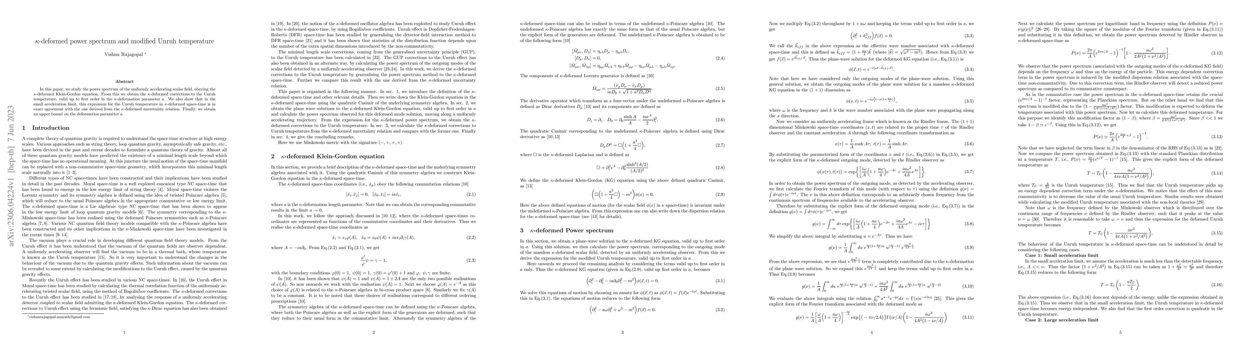 The paper presents a detailed derivation of the κ-deformed power spectrum and its implications on the Unruh temperature, providing a comprehensive analysis of modified temperature in κ-deformed space-time.