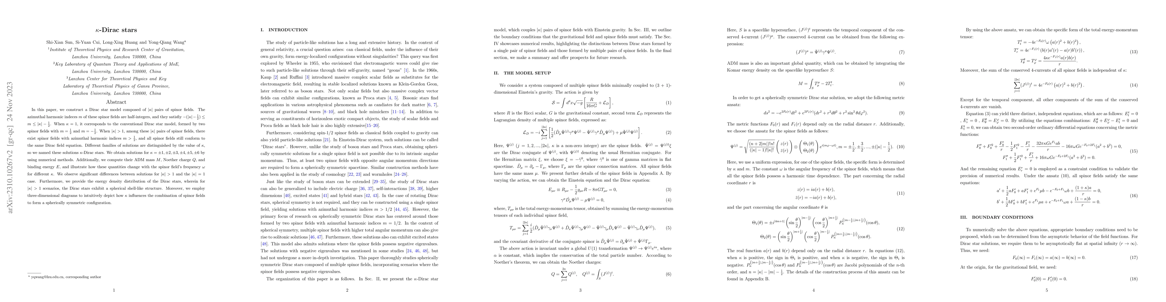 This paper constructs $\kappa$-Dirac star models using $|\kappa|$ pairs of spinor fields, distinguishing them by the value of $\kappa$. It finds significant differences in mass, charge, and energy density, especially for $|\kappa|>1$, showing a spherical shell-like structure and employing diagrams to illustrate the influence of $\kappa$.
