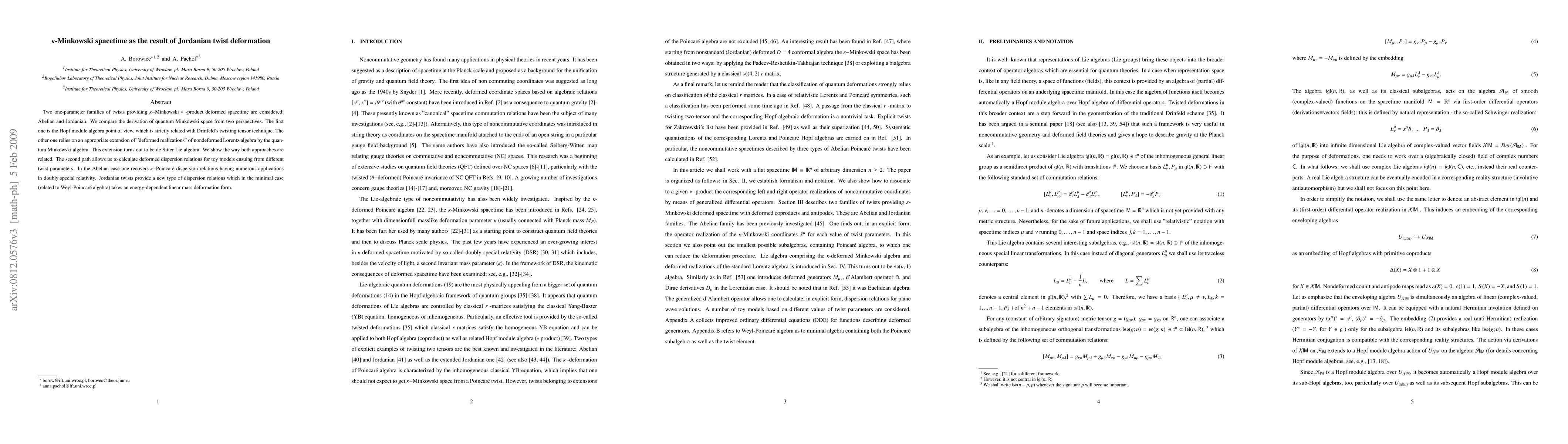 This paper explores the derivation of kappa-Minkowski spacetime through Abelian and Jordanian twist deformations, comparing two approaches: one based on Hopf module algebra and Drinfeld's twisting tensor, and another extending Lorentz algebra to quantum Minkowski algebra, resulting in de Sitter Lie algebra. It reveals the relationships between these methods and computes dispersion relations for toy models, highlighting the energy-dependent linear mass deformation from Jordanian twists.