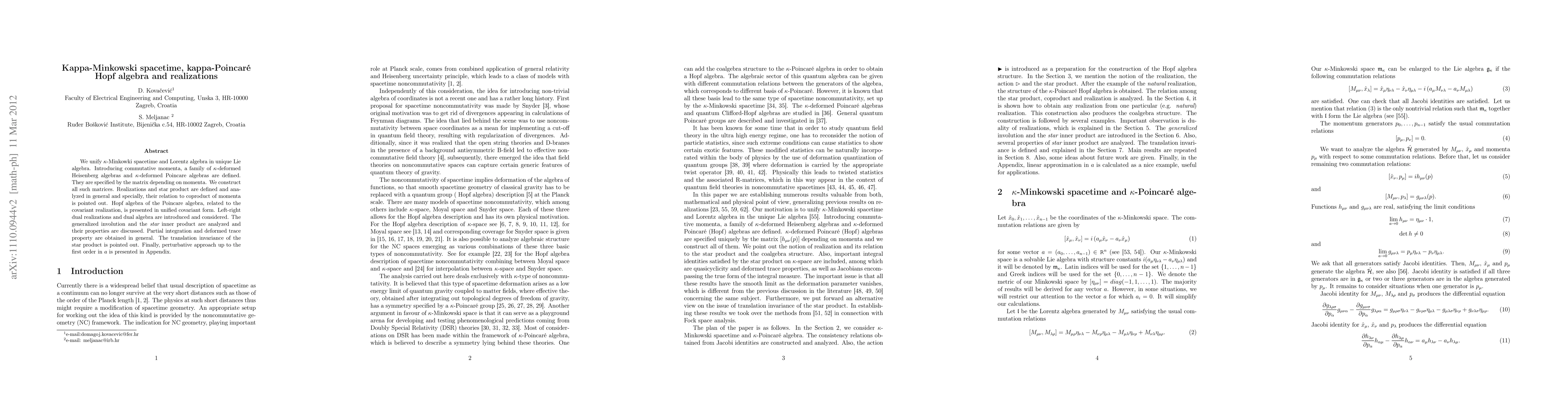 The paper unifies kappa-Minkowski spacetime and Lorentz algebra into a unique Lie algebra, defining kappa-deformed Heisenberg and Poincare algebras. It explores their realizations, star products, and properties, including left-right dual realizations and invariant integration, concluding with a perturbative approach up to first order.