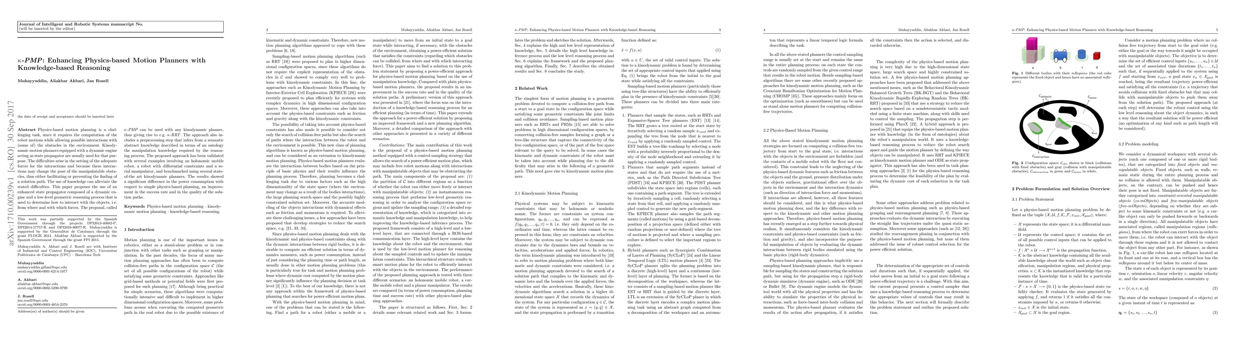 Physics-based motion planning is a challenging task, since it requires the computation of the robot motions while allowing possible interactions with (some of) the obstacles in the environment. Kinodynamic motion planners equipped with a dynamic engine acting as state propagator are usually used for that purpose. The difficulties arise in the setting of the adequate forces for the interactions and because these interactions may change the pose of the manipulatable obstacles, thus either facilitating or preventing the finding of a solution path. The use of knowledge can alleviate the stated difficulties. This paper proposes the use of an enhanced state propagator composed of a dynamic engine and a low-level geometric reasoning process that is used to determine how to interact with the objects, i.e. from where and with which forces. The proposal, called \k{appa}-PMP can be used with any kinodynamic planner, thus giving rise to e.g. \k{appa}-RRT. The approach also includes a preprocessing step that infers from a semantic abstract knowledge described in terms of an ontology the manipulation knowledge required by the reasoning process. The proposed approach has been validated with several examples involving an holonomic mobile robot, a robot with differential constraints and a serial manipulator, and benchmarked using several state-of-the art kinodynamic planners. The results showed a significant difference in the power consumption with respect to simple physics-based planning, an improvement in the success rate and in the quality of the solution paths.