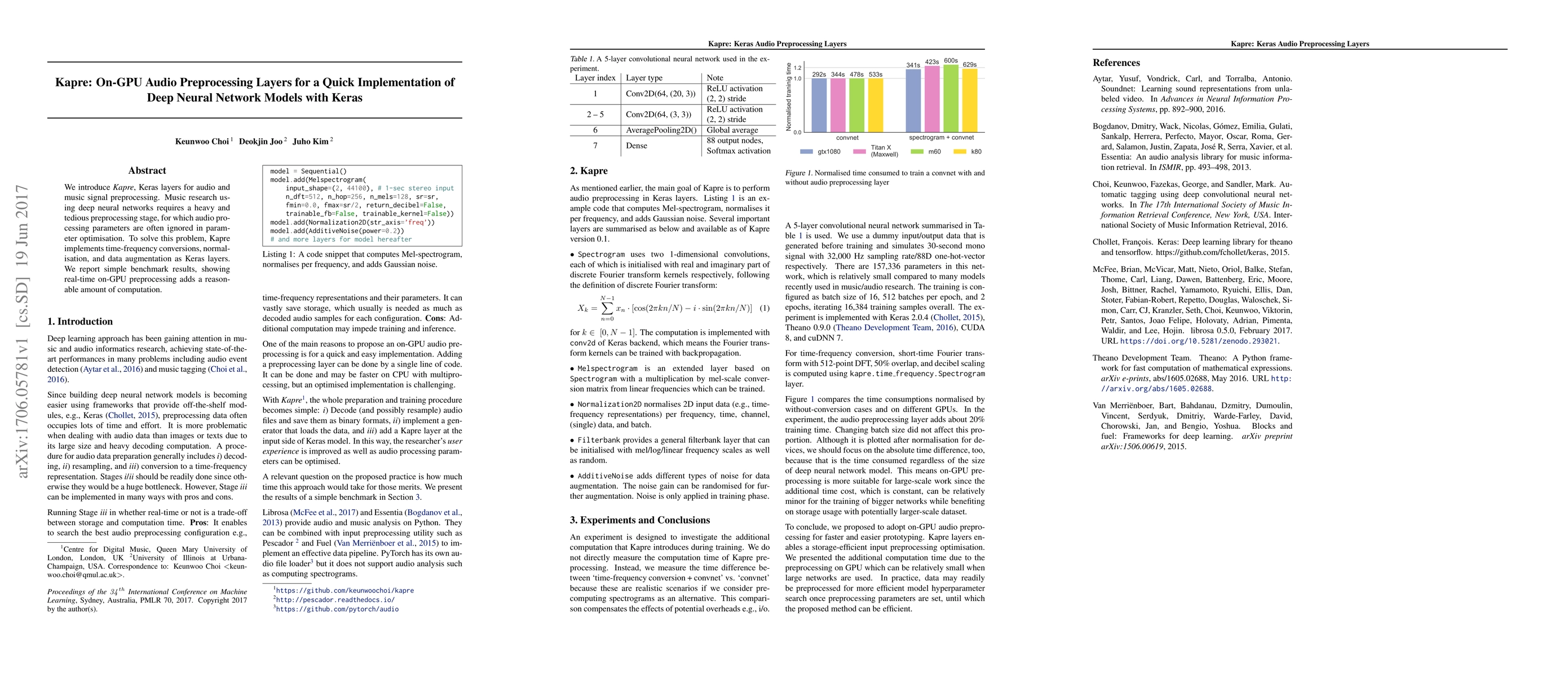 Kapre provides Keras layers for efficient audio and music signal preprocessing, addressing the heavy preprocessing burden in deep neural network models. It enables real-time on-GPU time-frequency conversions, normalization, and data augmentation, facilitating quicker model implementation.