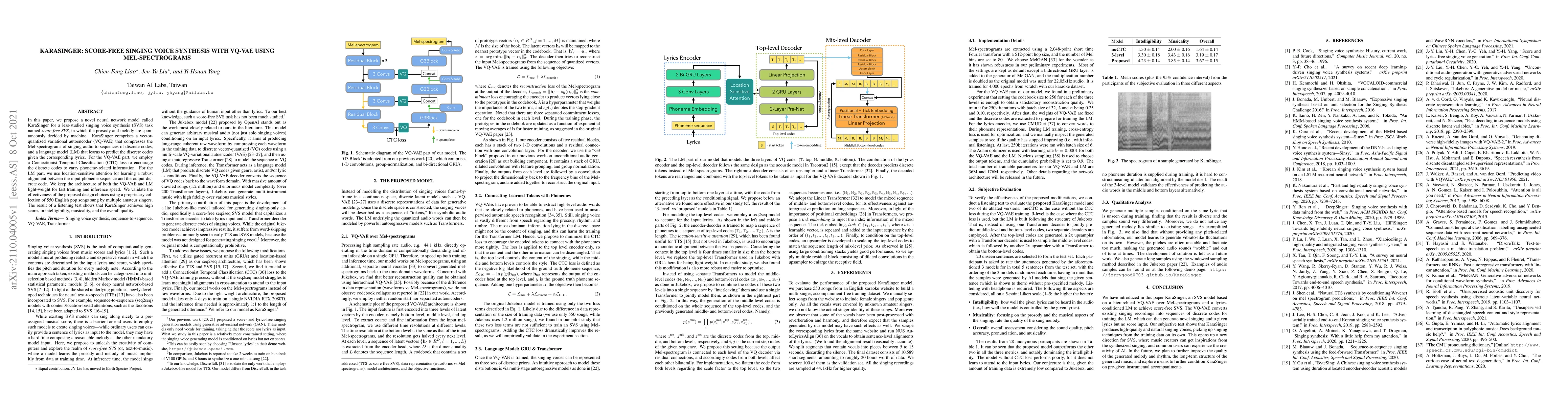 The paper introduces a novel SVS model, KaraSinger, that combines a hierarchical VQ-VAE and a lyrics-conditioned LM for score-free singing voice synthesis.