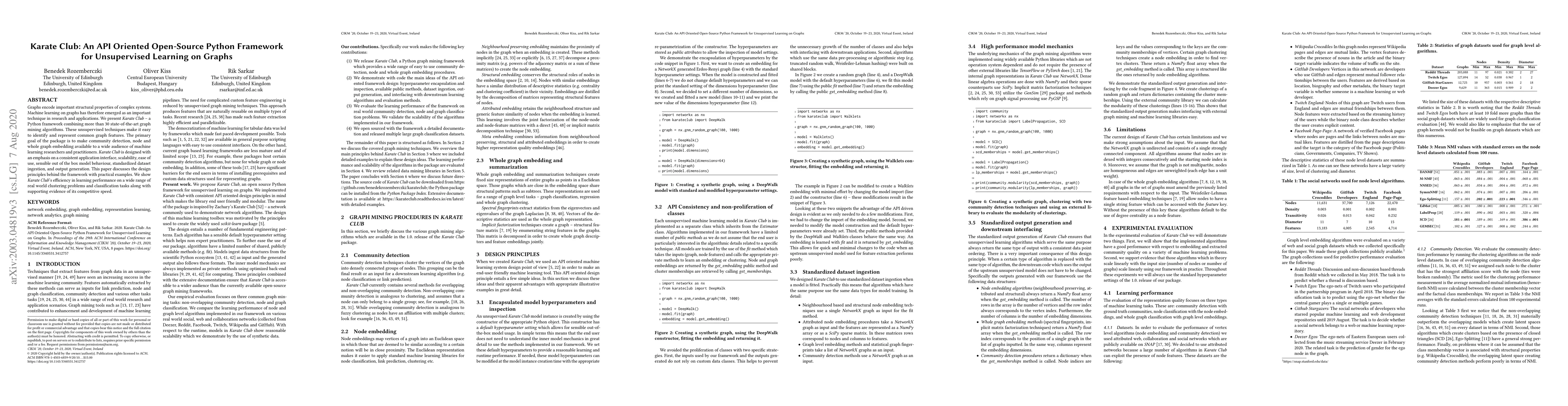 We present Karate Club a Python framework combining more than 30 state-of-the-art graph mining algorithms which can solve unsupervised machine learning tasks. The primary goal of the package is to make community detection, node and whole graph embedding available to a wide audience of machine learning researchers and practitioners. We designed Karate Club with an emphasis on a consistent application interface, scalability, ease of use, sensible out of the box model behaviour, standardized dataset ingestion, and output generation. This paper discusses the design principles behind this framework with practical examples. We show Karate Club's efficiency with respect to learning performance on a wide range of real world clustering problems, classification tasks and support evidence with regards to its competitive speed.