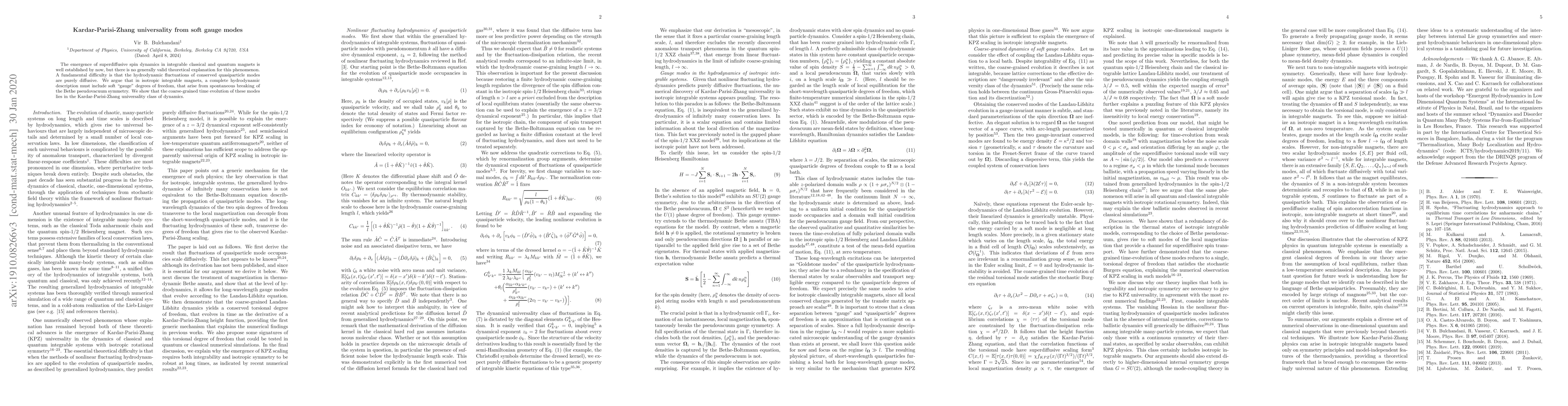 This paper argues that superdiffusive spin dynamics in integrable magnets can be explained by incorporating soft gauge modes arising from the spontaneous breaking of Bethe pseudovacuum symmetry, which leads to Kardar-Parisi-Zhang universality in their coarse-grained time evolution.