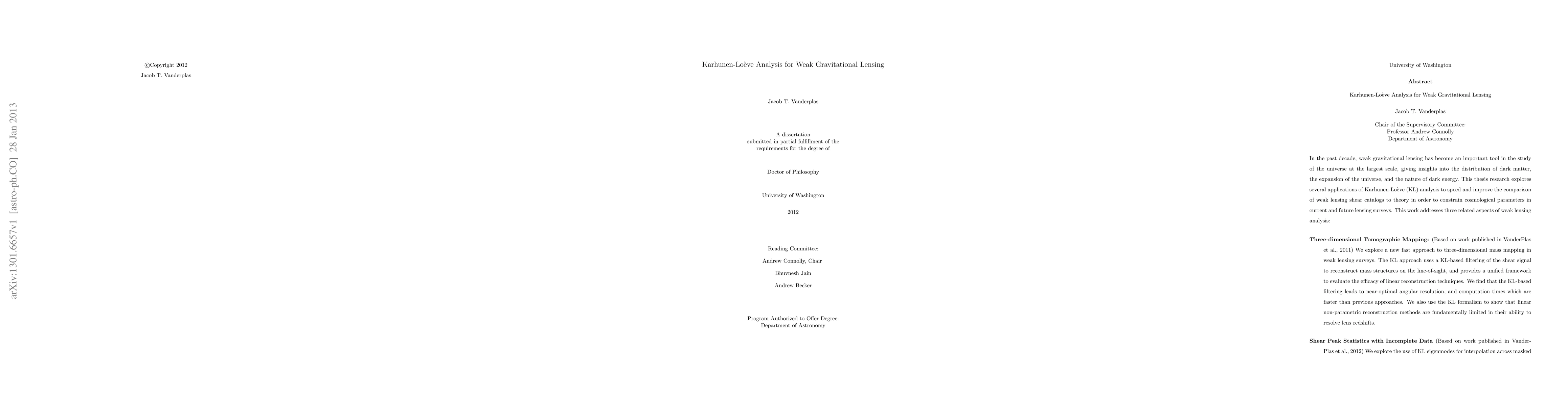 In the past decade, weak gravitational lensing has become an important tool in the study of the universe at the largest scale, giving insights into the distribution of dark matter, the expansion of the universe, and the nature of dark energy. This thesis research explores several applications of Karhunen-Loeve (KL) analysis to speed and improve the comparison of weak lensing shear catalogs to theory in order to constrain cosmological parameters in current and future lensing surveys. After providing a brief introduction to cosmology and to KL analysis, this work addresses three related aspects of weak lensing analysis: (1) Three-dimensional tomographic mapping (based on work published in Vanderplas et al. 2011); (2) Shear peak statistics with incomplete/gappy data (based on work published in Vanderplas et al. 2012); and (3) two-point parameter estimation from gappy data using KL modes (previously unpublished)... [this abstract has been abbreviated; please see the thesis for the full abstract].