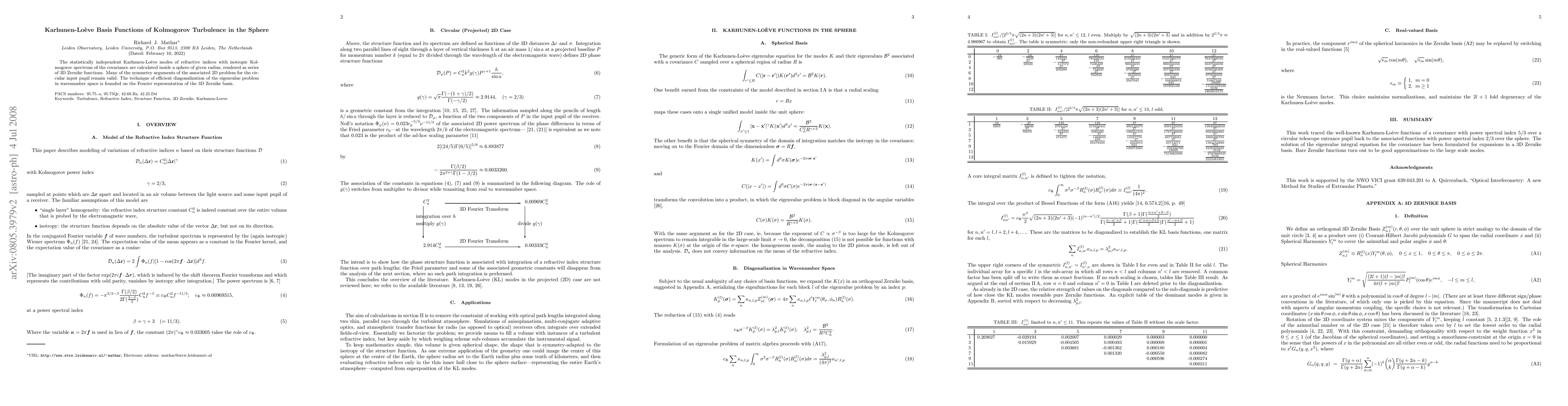 The statistically independent Karhunen-Loeve modes of refractive indices with isotropic Kolmogorov spectrum of the covariance are calculated in a sphere of given radius, rendered as series of 3D Zernike functions. Many of the symmetry arguments of the associated 2D problem for the circular input pupil remain valid. The technique of efficient diagonalization of the eigenvalue problem in wavenumber space is founded on the Fourier representation of the 3D Zernike basis.