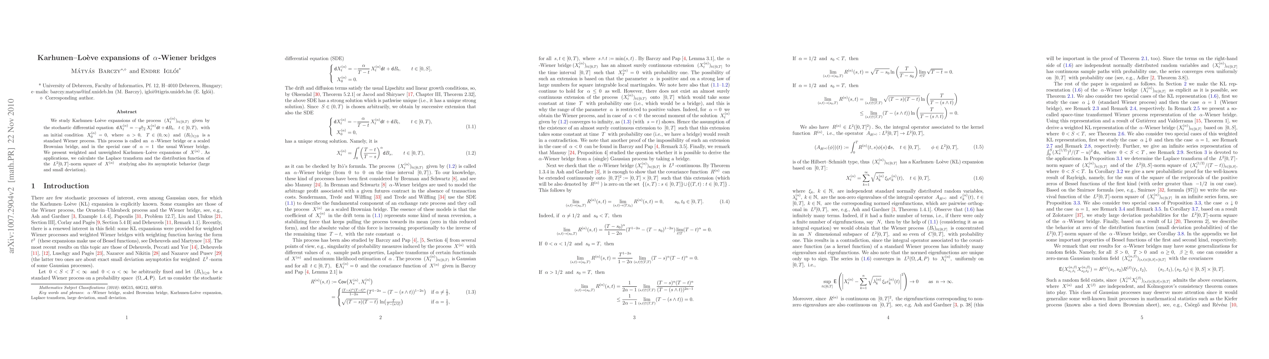 We study Karhunen-Loeve expansions of the process $(X_t^{(\alpha)})_{t\in[0,T)}$ given by the stochastic differential equation $dX_t^{(\alpha)} = -\frac\alpha{T-t} X_t^{(\alpha)} dt+ dB_t,$ $t\in[0,T),$ with an initial condition $X_0^{(\alpha)}=0,$ where $\alpha>0,$ $T\in(0,\infty)$ and $(B_t)_{t\geq 0}$ is a standard Wiener process. This process is called an $\alpha$-Wiener bridge or a scaled Brownian bridge, and in the special case of $\alpha=1$ the usual Wiener bridge. We present weighted and unweighted Karhunen-Loeve expansions of $X^{(\alpha)}$. As applications, we calculate the Laplace transform and the distribution function of the $L^2[0,T]$-norm square of $X^{(\alpha)}$ studying also its asymptotic behavior (large and small deviation).