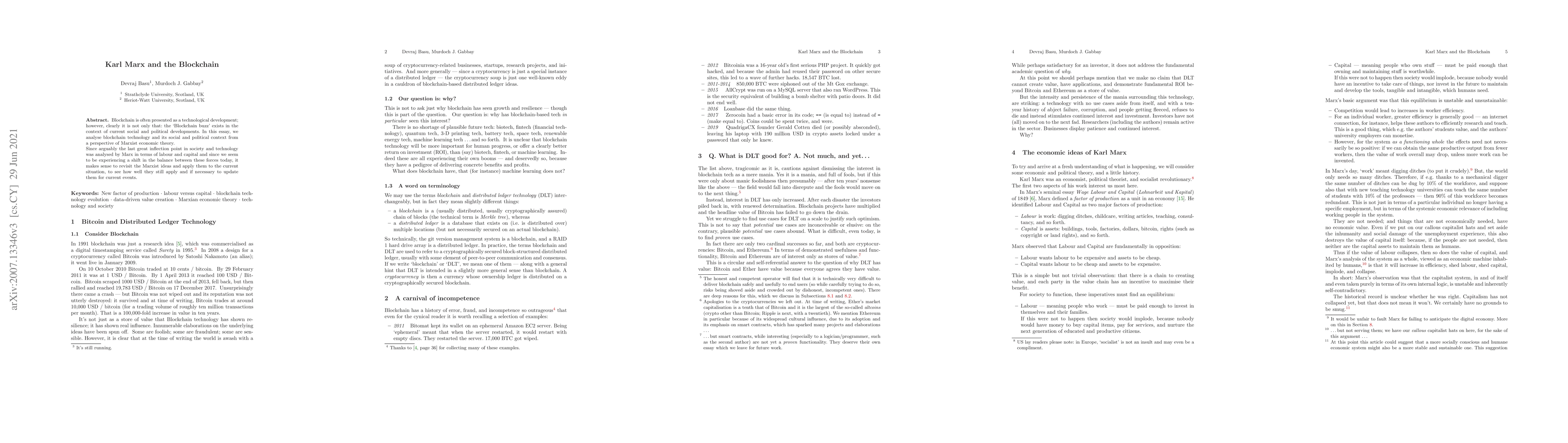 Blockchain is often presented as a technological development; however, clearly it is not only that: the `Blockchain buzz' exists in the context of current social and political developments. In this essay, we analyse blockchain technology and its social and political context from a perspective of Marxist economic theory. Since arguably the last great inflection point in society and technology was analysed by Marx in terms of labour and capital and since we seem to be experiencing a shift in the balance between these forces today, it makes sense to revisit the Marxist ideas and apply them to the current situation, to see how well they still apply and if necessary to update them for current events.