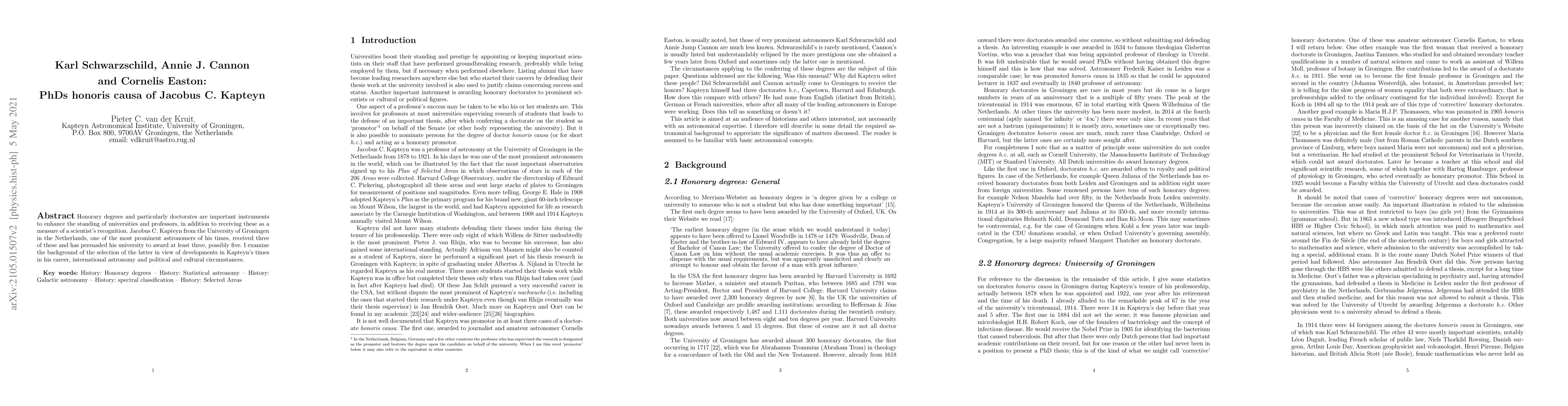 Honorary degrees and particularly doctorates are important instruments to enhance the standing of universities and professors, in addition to receiving these as a measure of a scientist's recognition. Jacobus C. Kapteyn from the University of Groningen in the Netherlands, one of the most prominent astronomers of his times, received three of these and has persuaded his university to award at least three, possibly five. I examine the background of the selection of the latter in view of developments in Kapteyn's times in his career, international astronomy and political and cultural circumstances.