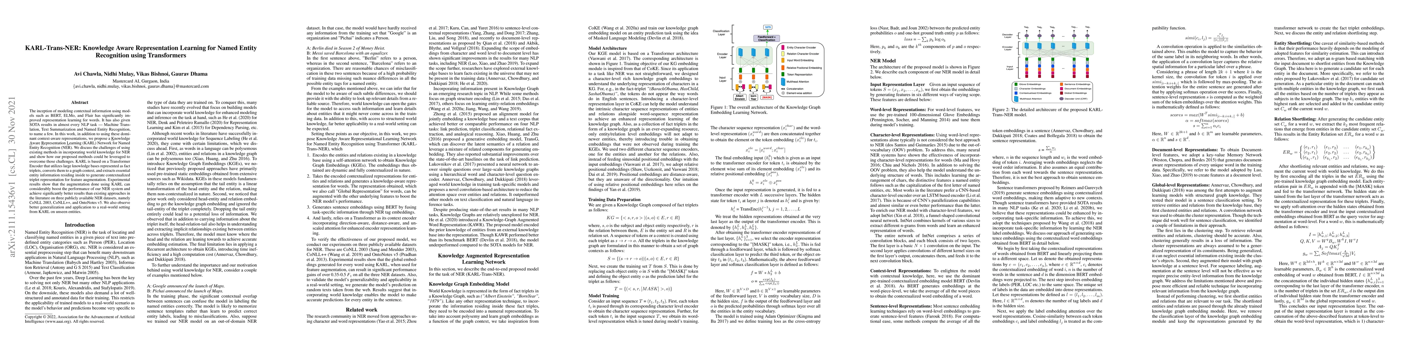 The inception of modeling contextual information using models such as BERT, ELMo, and Flair has significantly improved representation learning for words. It has also given SOTA results in almost every NLP task - Machine Translation, Text Summarization and Named Entity Recognition, to name a few. In this work, in addition to using these dominant context-aware representations, we propose a Knowledge Aware Representation Learning (KARL) Network for Named Entity Recognition (NER). We discuss the challenges of using existing methods in incorporating world knowledge for NER and show how our proposed methods could be leveraged to overcome those challenges. KARL is based on a Transformer Encoder that utilizes large knowledge bases represented as fact triplets, converts them to a graph context, and extracts essential entity information residing inside to generate contextualized triplet representation for feature augmentation. Experimental results show that the augmentation done using KARL can considerably boost the performance of our NER system and achieve significantly better results than existing approaches in the literature on three publicly available NER datasets, namely CoNLL 2003, CoNLL++, and OntoNotes v5. We also observe better generalization and application to a real-world setting from KARL on unseen entities.