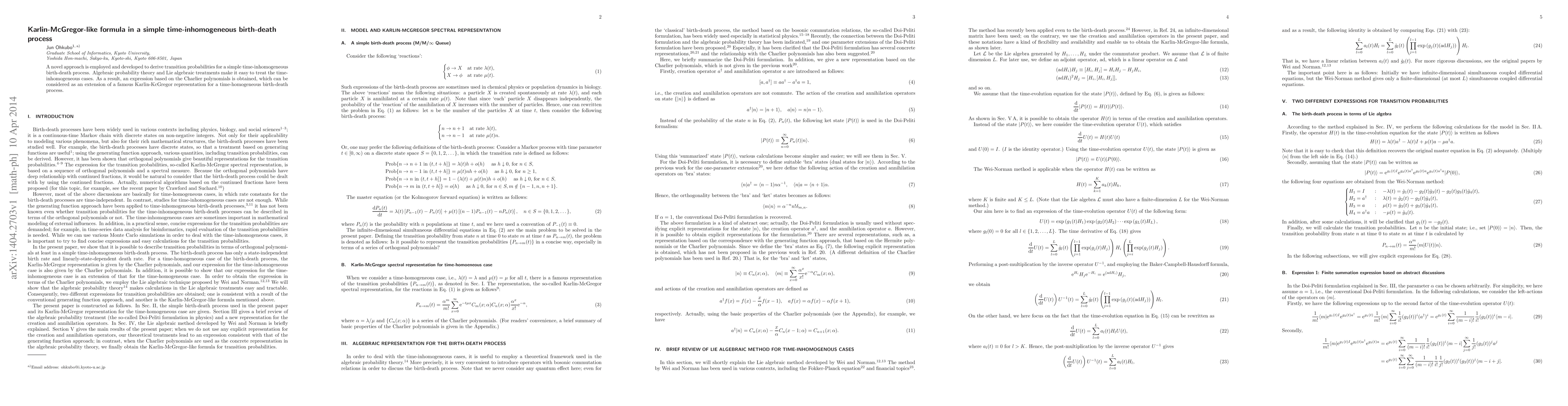 Summary: This paper develops a novel approach using algebraic probability theory and Lie algebra to derive transition probabilities for a time-inhomogeneous birth-death process, resulting in an expression based on Charlier polynomials that extends the Karlin-McGregor formula for time-homogeneous cases.