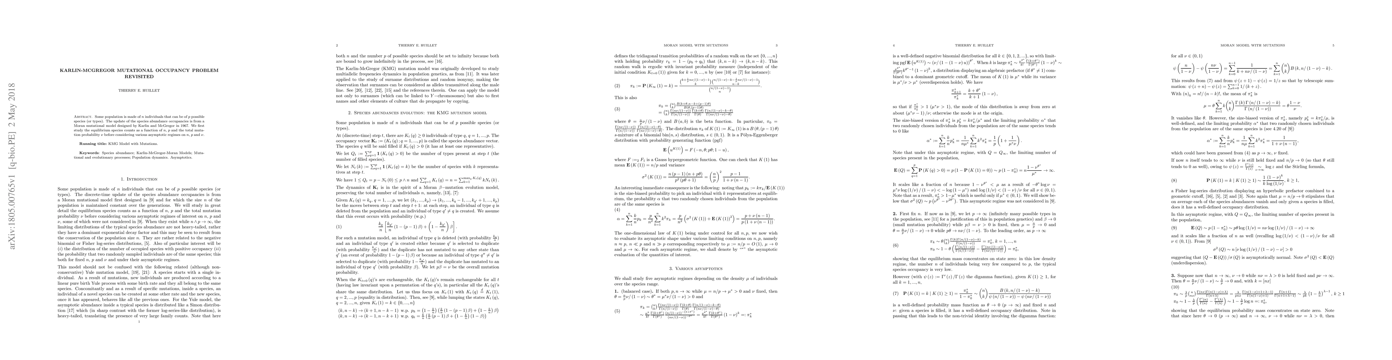 Some population is made of n individuals that can be of p possible species (or types). The update of the species abundance occupancies is from a Moran mutational model designed by Karlin and McGregor in 1967. We first study the equilibrium species counts as a function of n, p and the total mutation probability $\nu$ before considering various asymptotic regimes on n, p and $\nu$. Running title: KMG Model with Mutations.