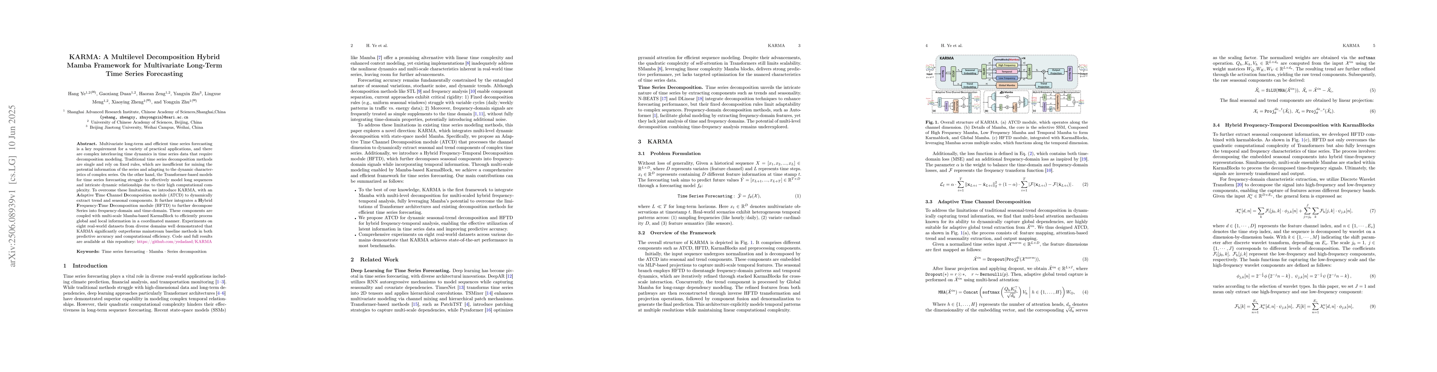 Multivariate long-term and efficient time series forecasting is a key requirement for a variety of practical applications, and there are complex interleaving time dynamics in time series data that require decomposition modeling. Traditional time series decomposition methods are single and rely on fixed rules, which are insufficient for mining the potential information of the series and adapting to the dynamic characteristics of complex series. On the other hand, the Transformer-based models for time series forecasting struggle to effectively model long sequences and intricate dynamic relationships due to their high computational complexity. To overcome these limitations, we introduce KARMA, with an Adaptive Time Channel Decomposition module (ATCD) to dynamically extract trend and seasonal components. It further integrates a Hybrid Frequency-Time Decomposition module (HFTD) to further decompose Series into frequency-domain and time-domain. These components are coupled with multi-scale Mamba-based KarmaBlock to efficiently process global and local information in a coordinated manner. Experiments on eight real-world datasets from diverse domains well demonstrated that KARMA significantly outperforms mainstream baseline methods in both predictive accuracy and computational efficiency. Code and full results are available at this repository: https://github.com/yedadasd/KARMA