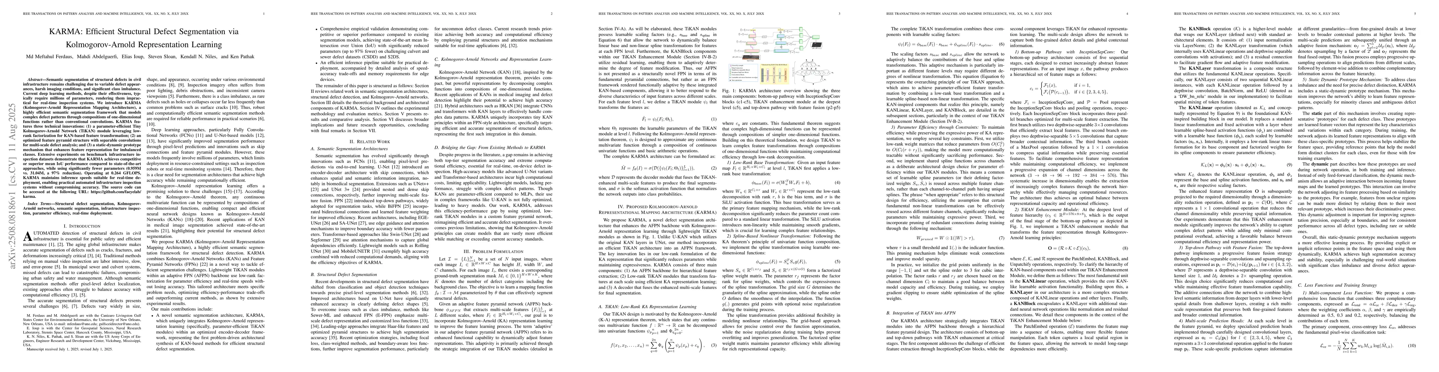 The research employs a comprehensive experimental methodology, including statistical analysis, ablation studies, cross-validation, and robustness testing. It introduces KARMA, a highly efficient semantic segmentation framework for structural defects using Kolmogorov-Arnold representation learning.