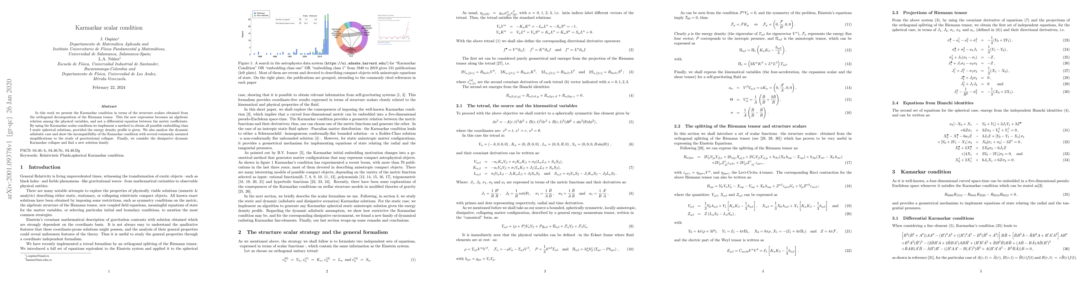 In this work we present the Karmarkar condition in terms of the structure scalars obtained from the orthogonal decomposition of the Riemann tensor. This the new expression becomes an algebraic relation among the physical variables, and not a differential equation between the metric coefficients. By using the Karmarkar scalar condition we implement a method to obtain all possible embedding class I static spherical solutions, provided the energy density profile is given. We also analyse the dynamic adiabatic case and show the incompatibility of the Kamarkar condition with several commonly assumed simplifications to the study of gravitational collapse. Finally, we consider the dissipative dynamic Karmarkar collapse and find a new solution family.