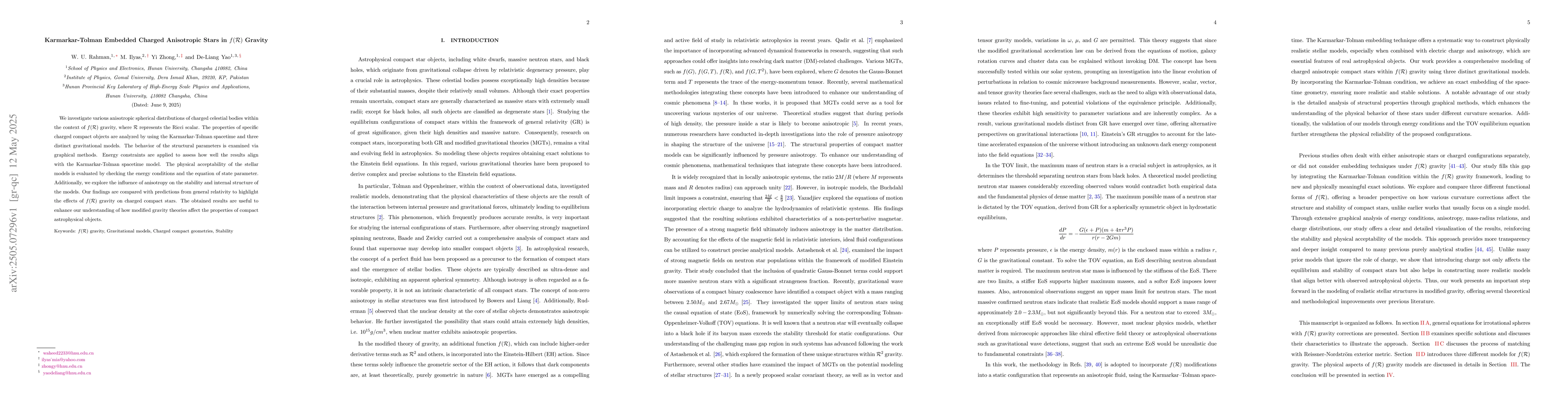 The research investigates anisotropic charged celestial bodies using Karmarkar-Tolman spacetime and three f(R) gravity models, analyzing structural parameters and applying energy constraints.