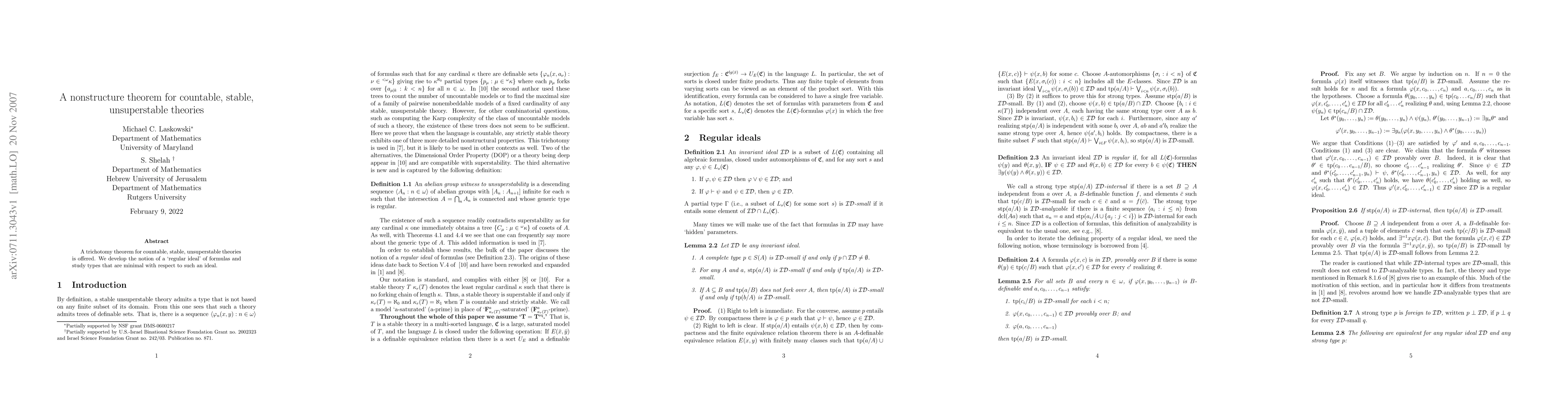 A trichotomy theorem for countable, stable, unsuperstable theories is offered. We develop the notion of a `regular ideal' of formulas and study types that are minimal with respect to such an ideal.
