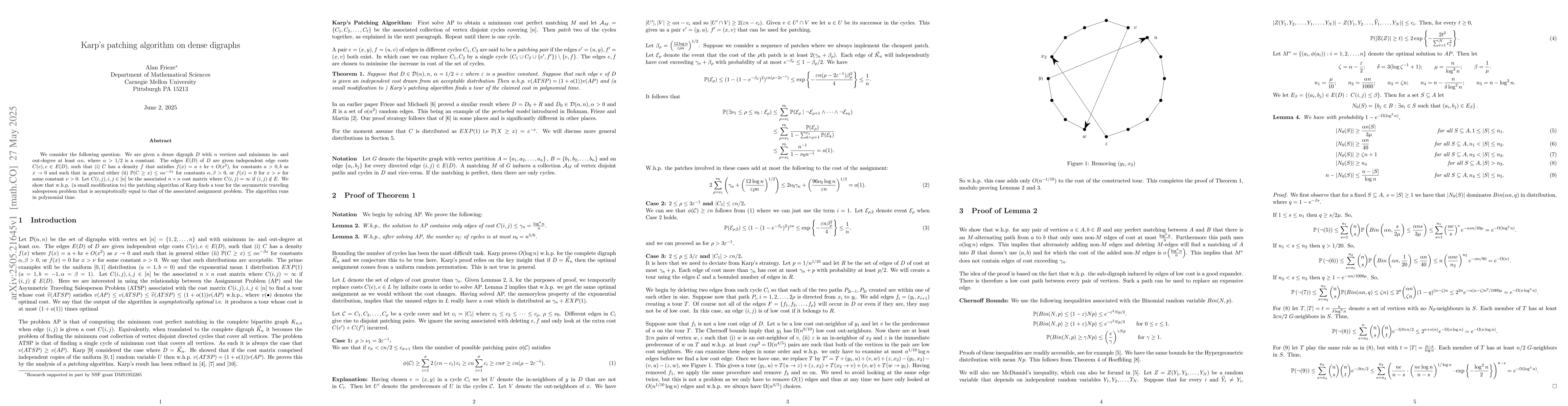 The research investigates Karp's patching algorithm on dense digraphs with specified in- and out-degree conditions and edge costs with given density properties.