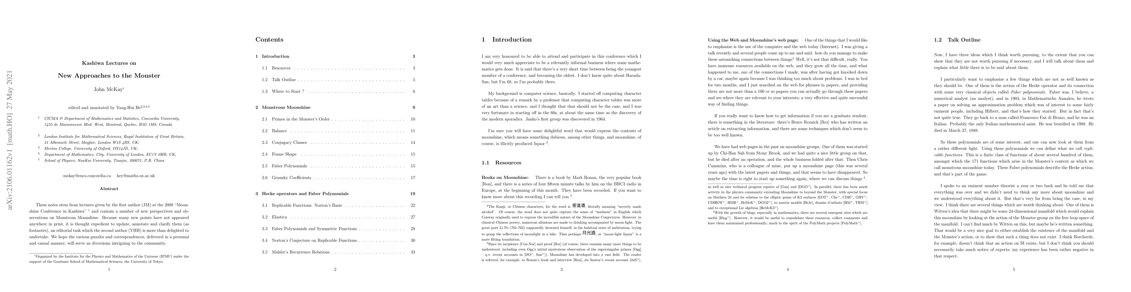 These notes stem from lectures given by the first author (JM) at the 2008 "Moonshine Conference in Kashiwa" and contain a number of new perspectives and observations on Monstrous Moonshine. Because many new points have not appeared anywhere in print, it is thought expedient to update, annotate and clarify them (as footnotes), an editorial task which the second author (YHH) is more than delighted to undertake. We hope the various puzzles and correspondences, delivered in a personal and casual manner, will serve as diversions intriguing to the community.