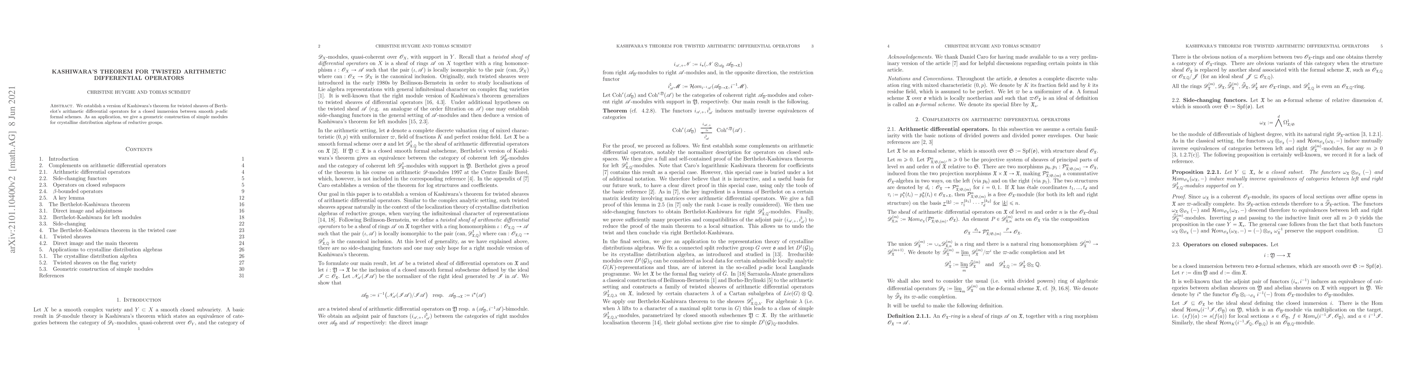Kashiwara's theorem is adapted for twisted arithmetic differential operators in smooth p-adic formal schemes, facilitating the construction of simple modules for crystalline distribution algebras of reductive groups via a twisted crystalline localization.