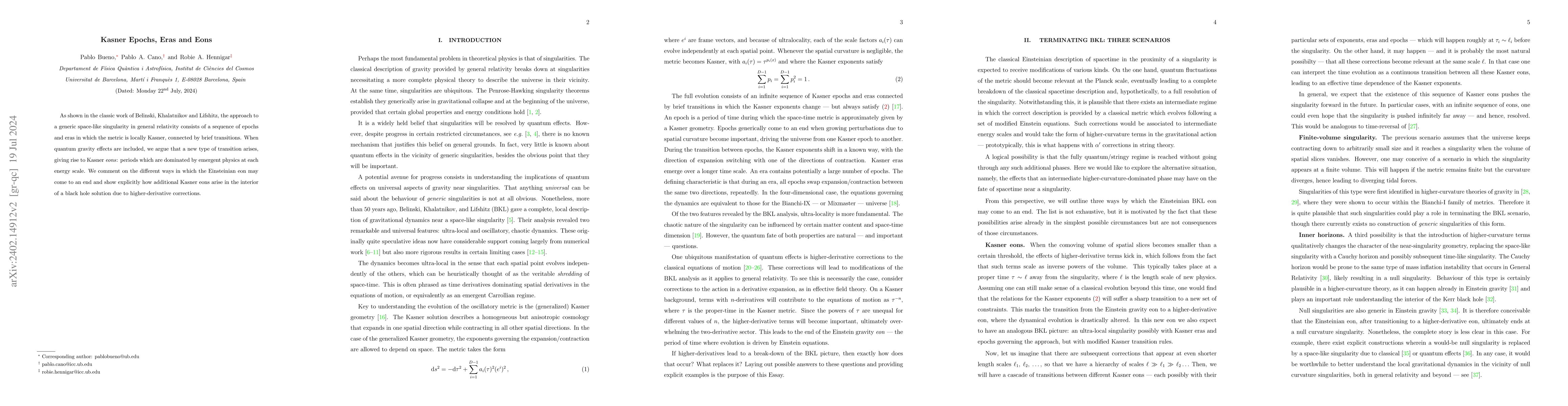 This paper explores the emergence of Kasner eons in general relativity when quantum gravity effects are considered, suggesting that these are periods dominated by emergent physics at each energy scale. It also discusses how higher-derivative corrections can lead to additional Kasner eons within black hole solutions.