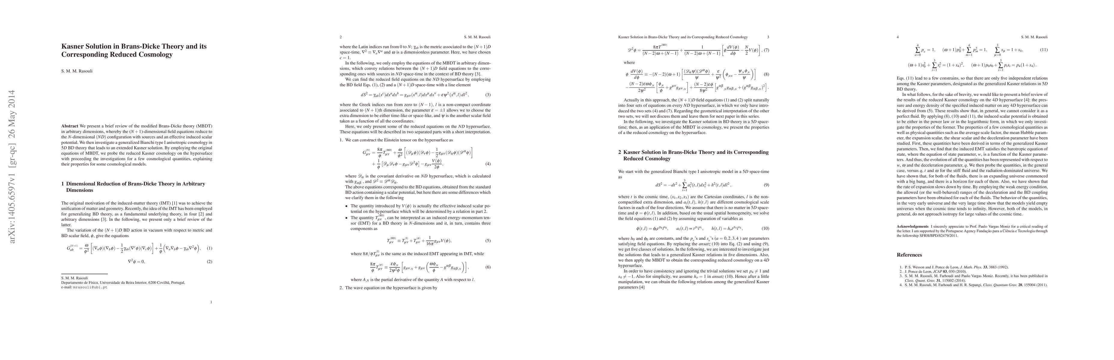 We present a brief review of the modified Brans-Dicke theory (MBDT) in arbitrary dimensions, whereby the ($N+1$)-dimensional field equations reduce to the $N$-dimensional $(ND)$ configuration with sources and an effective induced scalar potential. We then investigate a generalized Bianchi type~I anisotropic cosmology in $5D$ BD theory that leads to an extended Kasner solution. By employing the original equations of MBDT, we probe the reduced Kasner cosmology on the hypersuface with proceeding the investigations for a few cosmological quantities, explaining their properties for some cosmological models.}