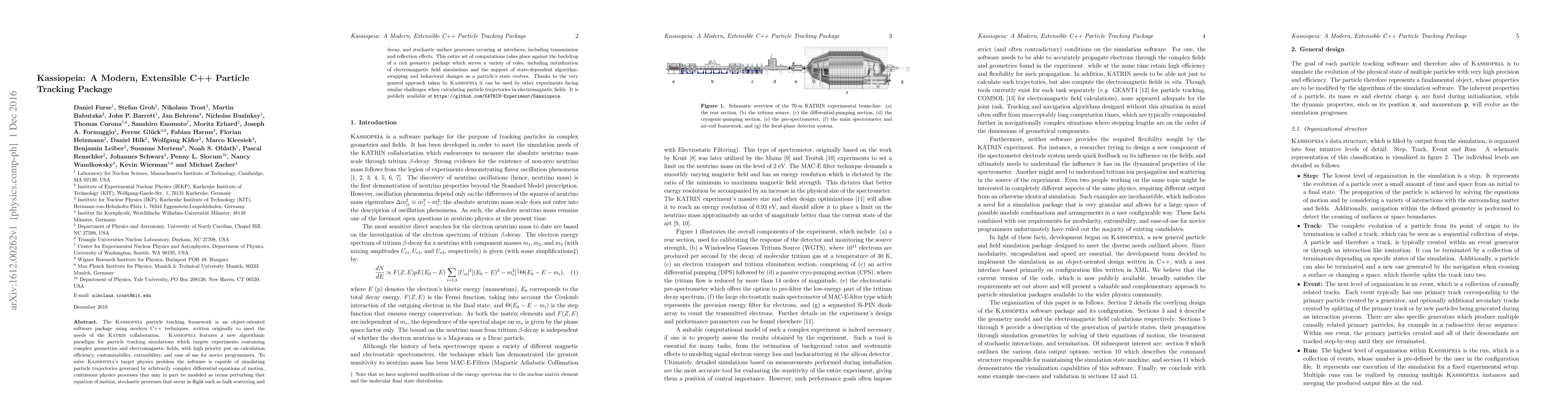 Kassiopeia is an advanced C++ particle tracking software designed for complex simulations in experiments with intricate geometries and electromagnetic fields, emphasizing efficiency and ease of use. It supports a wide range of particle trajectory computations, including differential equations, stochastic processes, and interface interactions, and is publicly available for broader experimental applications.