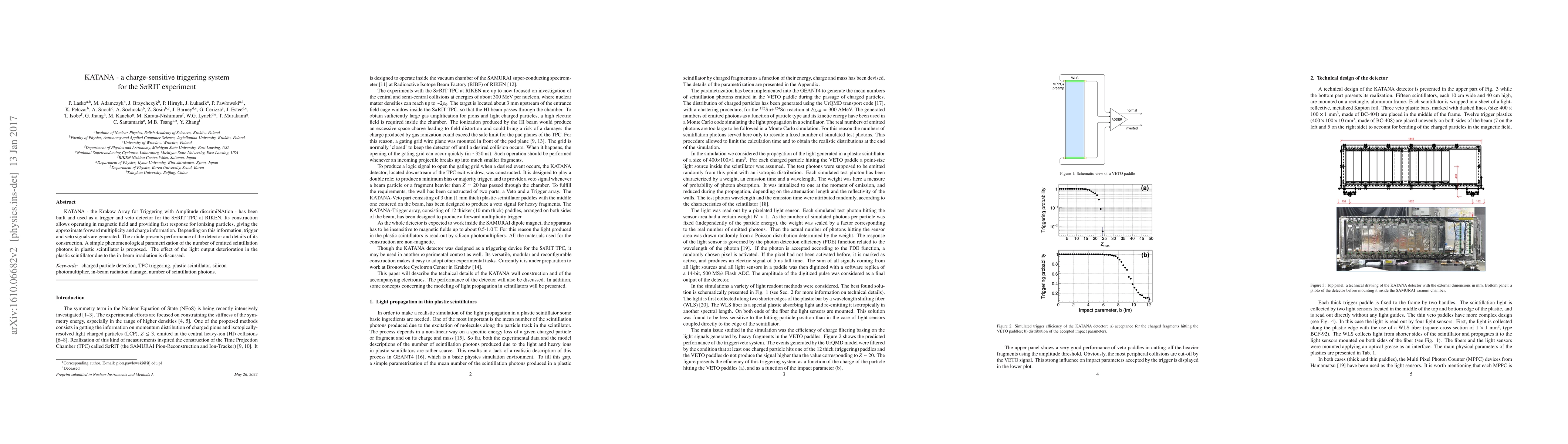 KATANA is a charge-sensitive triggering system for the S$\pi$RIT experiment, designed to operate in magnetic fields and provide fast response for ionizing particles. The detector generates trigger and veto signals based on forward multiplicity and charge information, and discusses its construction and performance, including the effects of in-beam irradiation on scintillation light output.