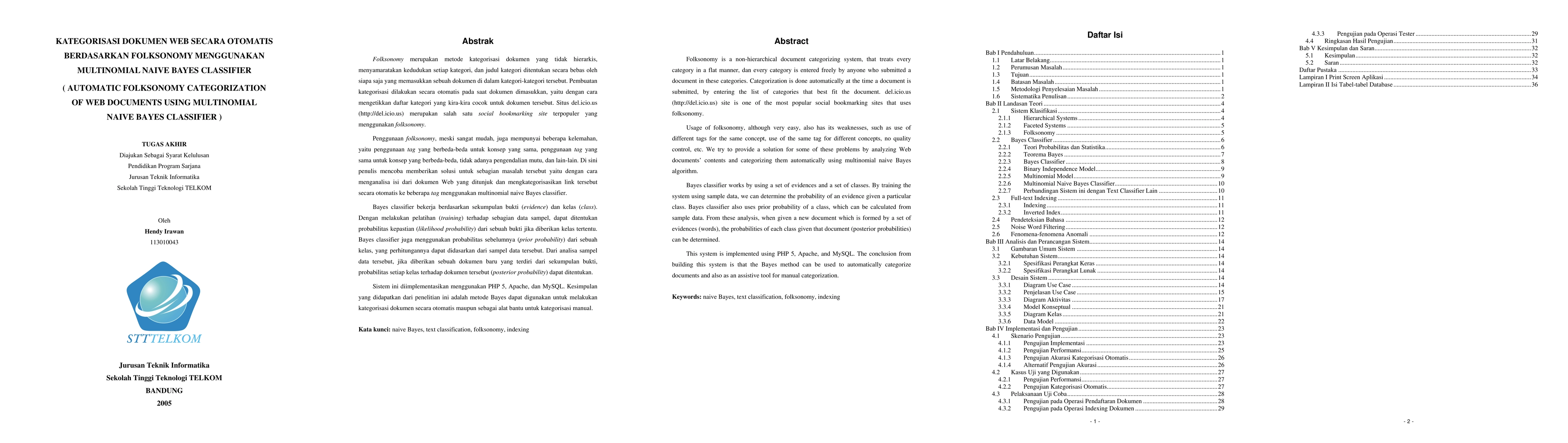 Folksonomy is a non-hierarchical document categorizing system, that treats every category in a flat manner, dan every category is entered freely by anyone who submitted a document in these categories. Categorization is done automatically at the time a document is submitted, by entering the list of categories that best fit the document. del.icio.us (http://del.icio.us) site is one of the most popular social bookmarking sites that uses folksonomy. Usage of folksonomy, although very easy, also has its weaknesses, such as use of different tags for the same concept, use of the same tag for different concepts, no quality control, etc. We try to provide a solution for some of these problems by analyzing Web documents' contents and categorizing them automatically using multinomial naive Bayes algorithm. Bayes classifier works by using a set of evidences and a set of classes. By training the system using sample data, we can determine the probability of an evidence given a particular class. Bayes classifier also uses prior probability of a class, which can be calculated from sample data. From these analysis, when given a new document which is formed by a set of evidences (words), the probabilities of each class given that document (posterior probabilities) can be determined. This system is implemented using PHP 5, Apache, and MySQL. The conclusion from building this system is that the Bayes method can be used to automatically categorize documents and also as an assistive tool for manual categorization. ----- Folksonomy merupakan metode kategorisasi dokumen yang tidak hierarkis, menyamaratakan kedudukan setiap kategori, dan judul kategori ditentukan secara bebas oleh siapa saja yang memasukkan sebuah dokumen di dalam kategori-kategori tersebut.