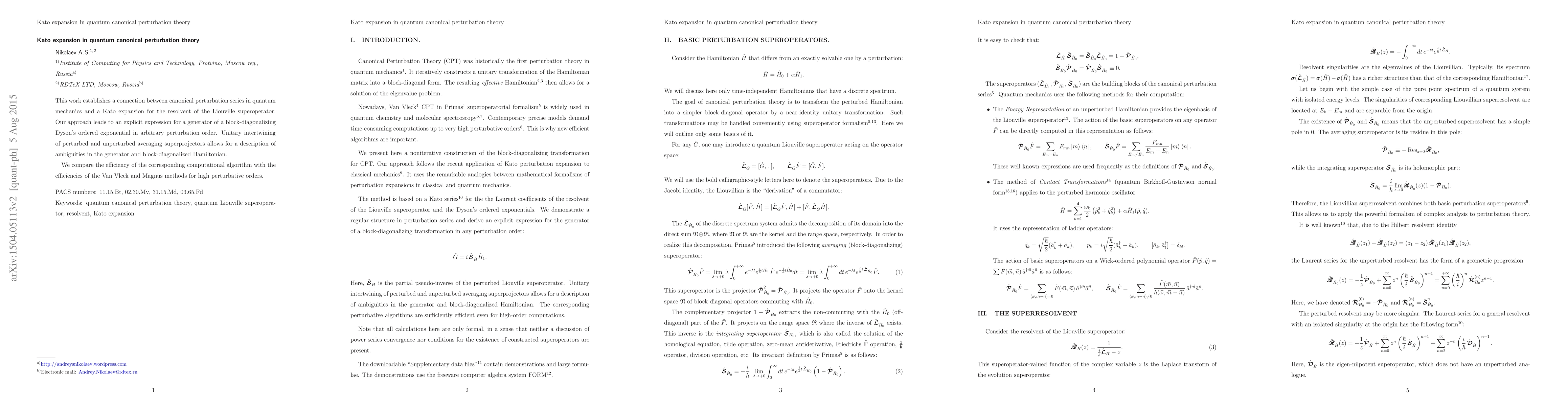 This work establishes a connection between canonical perturbation series in quantum mechanics and a Kato expansion for the resolvent of the Liouville superoperator. Our approach leads to an explicit expression for a generator of a block-diagonalizing Dyson's ordered exponential in arbitrary perturbation order. Unitary intertwining of perturbed and unperturbed averaging superprojectors allows for a description of ambiguities in the generator and block-diagonalized Hamiltonian. We compare the efficiency of the corresponding computational algorithm with the efficiencies of the Van Vleck and Magnus methods for high perturbative orders.