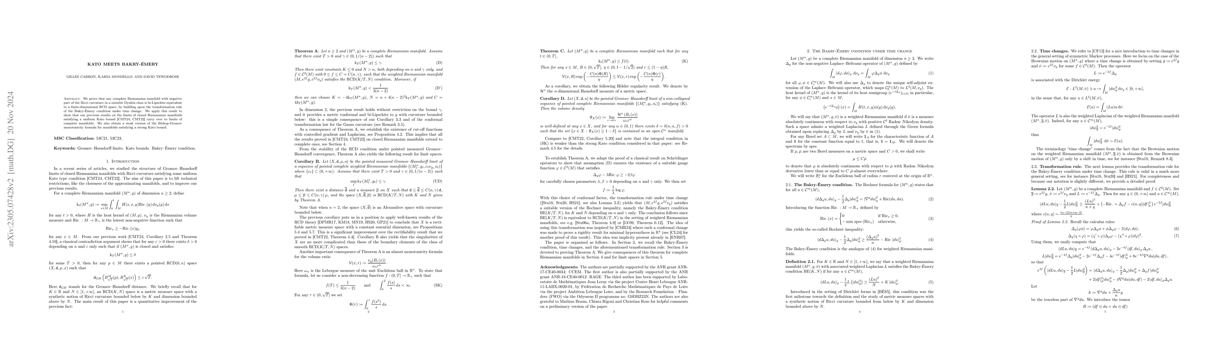 We prove that any complete Riemannian manifold with negative part of the Ricci curvature in a suitable Dynkin class is bi-Lipschitz equivalent to a finite-dimensional $\mathrm{RCD}$ space, by building upon the transformation rule of the Bakry-\'Emery condition under time change. We apply this result to show that our previous results on the limits of closed Riemannian manifolds satisfying a uniform Kato bound carry over to limits of complete manifolds. We also obtain a weak version of the Bishop-Gromov monotonicity formula for manifolds satisfying a strong Kato bound.