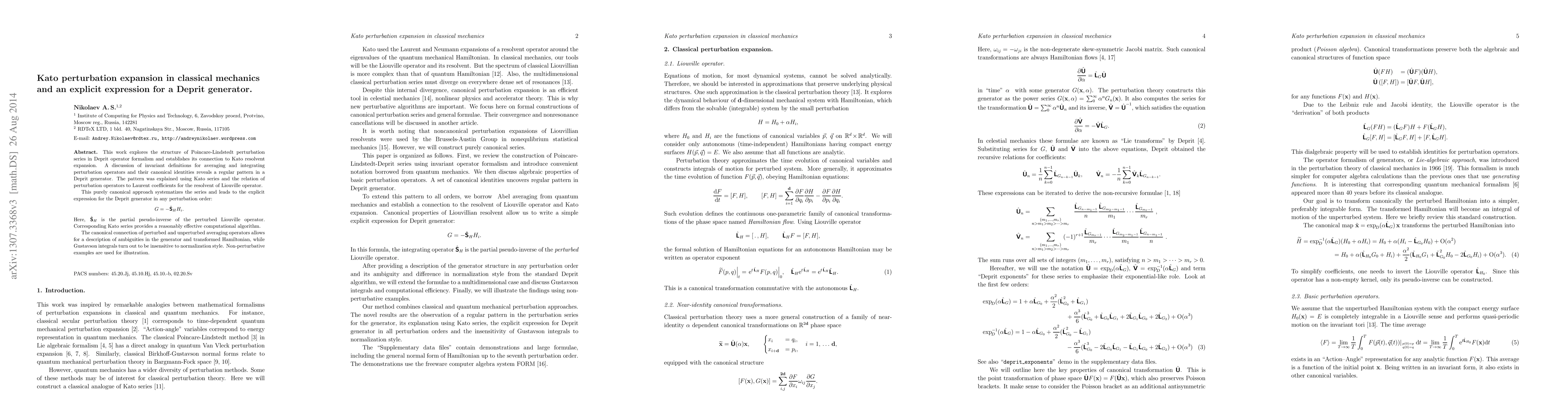 This work explores the structure of Poincare-Lindstedt perturbation series in Deprit operator formalism and establishes its connection to Kato resolvent expansion. A discussion of invariant definitions for averaging and integrating perturbation operators and their canonical identities reveals a regular pattern in a Deprit generator. The pattern was explained using Kato series and the relation of perturbation operators to Laurent coefficients for the resolvent of Liouville operator. This purely canonical approach systematizes the series and leads to the explicit expression for the Deprit generator in any perturbation order: \[G = - \hat{\mathsf S}_H H_i.\] Here, $\hat{\mathsf S}_H$ is the partial pseudo-inverse of the perturbed Liouville operator. Corresponding Kato series provides a reasonably effective computational algorithm. The canonical connection of perturbed and unperturbed averaging operators allows for a description of ambiguities in the generator and transformed Hamiltonian, while Gustavson integrals turn out to be insensitive to normalization style. Non-perturbative examples are used for illustration.