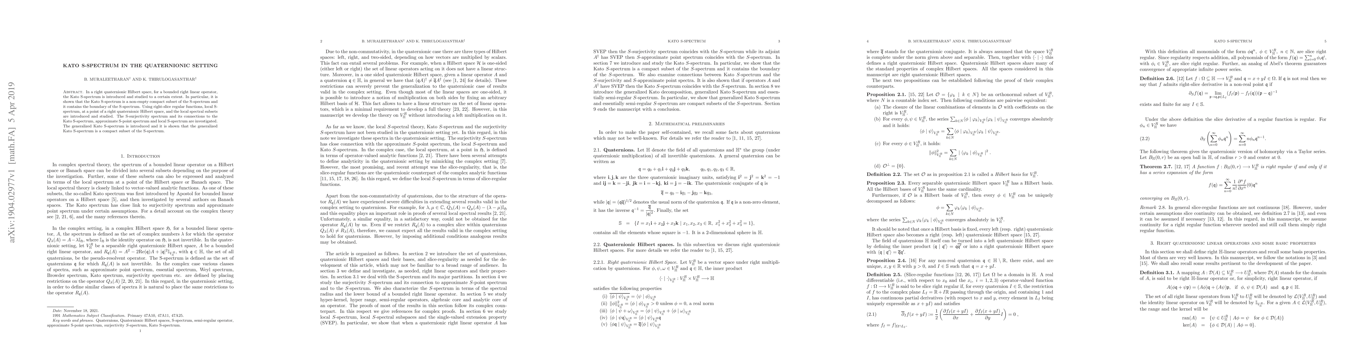 This paper introduces and studies the Kato S-spectrum in the context of right quaternionic Hilbert spaces, demonstrating that it is a non-empty compact subset of the S-spectrum containing its boundary. It also explores the generalized Kato S-spectrum and its connections to local S-spectrum and approximate S-point spectrum.