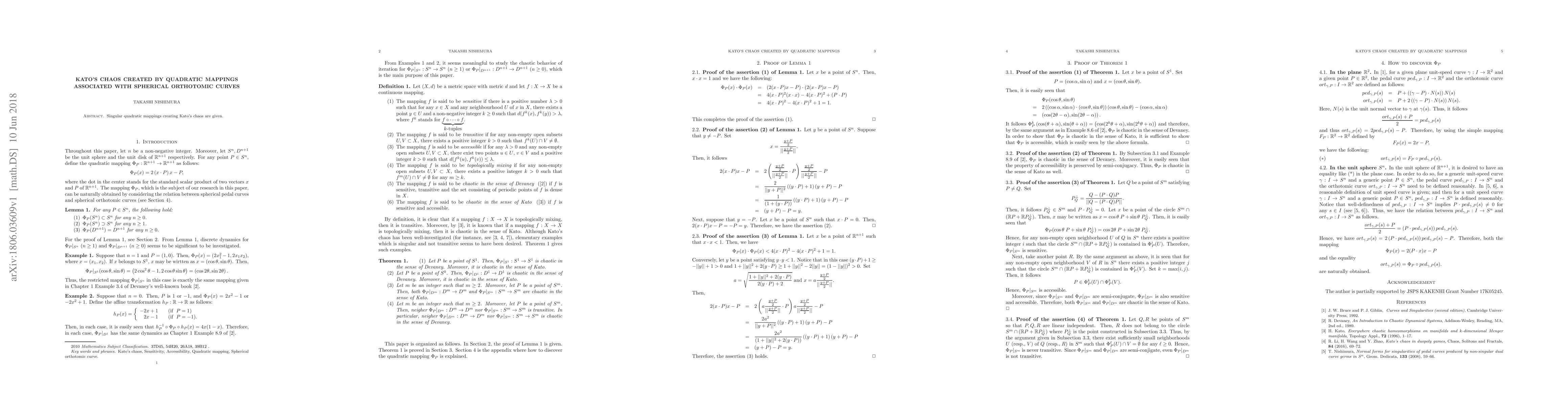 Summary: The paper explores singular quadratic mappings that generate Kato's chaos, specifically linked to spherical orthotomic curves, providing a detailed mathematical framework for understanding this chaotic behavior.