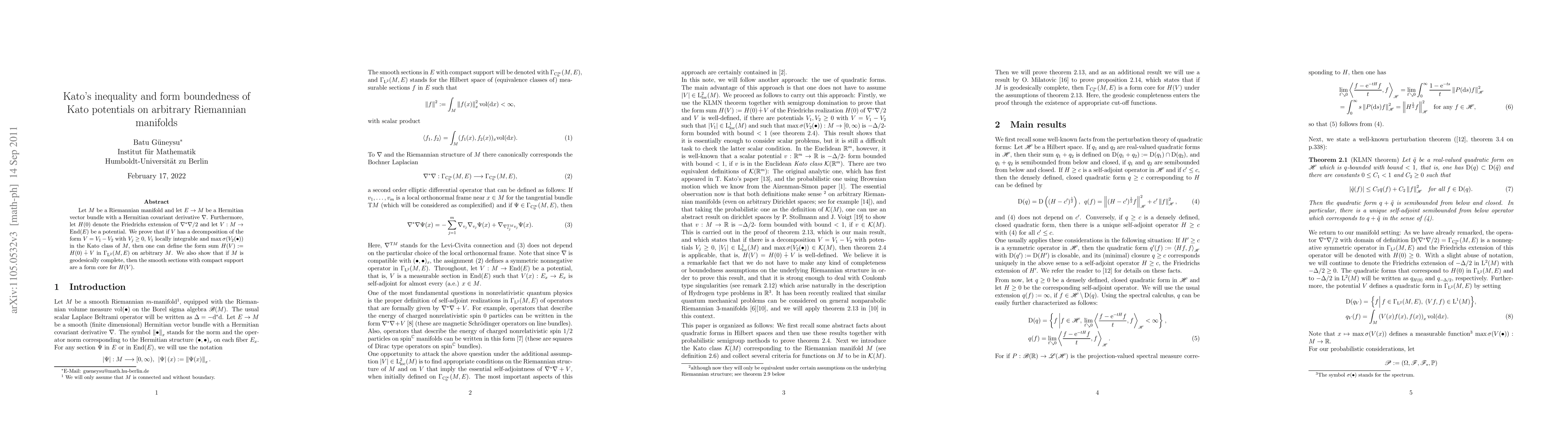 This paper proves that if a potential $V$ satisfies the Kato class condition on a Riemannian manifold $(M,g)$, then $V^-$ is H(0)-form bounded with a bound less than 1, allowing the definition of the form sum $H(V)=H(0)\dotplus V$. This provides a sufficient condition for defining $H(V)$ on arbitrary Riemannian manifolds.