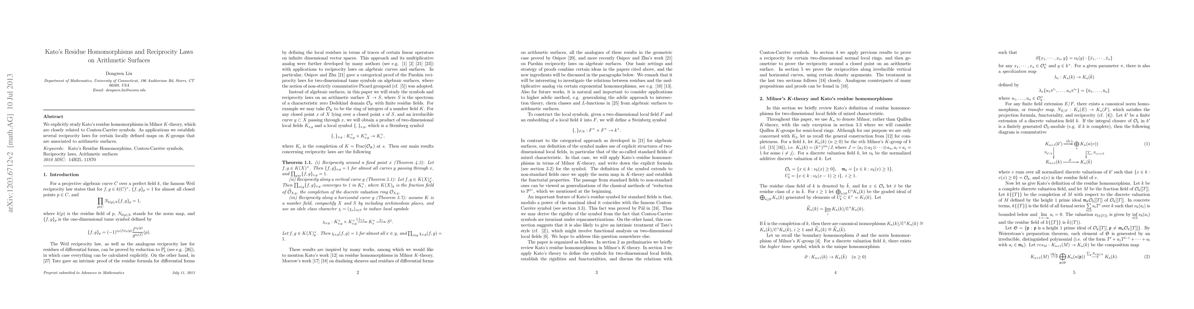This paper investigates Kato's residue homomorphisms in Milnor $K$-theory, linking them to Contou-Carrère symbols, and uses these to establish new reciprocity laws for locally defined maps on $K$-groups associated with arithmetic surfaces.