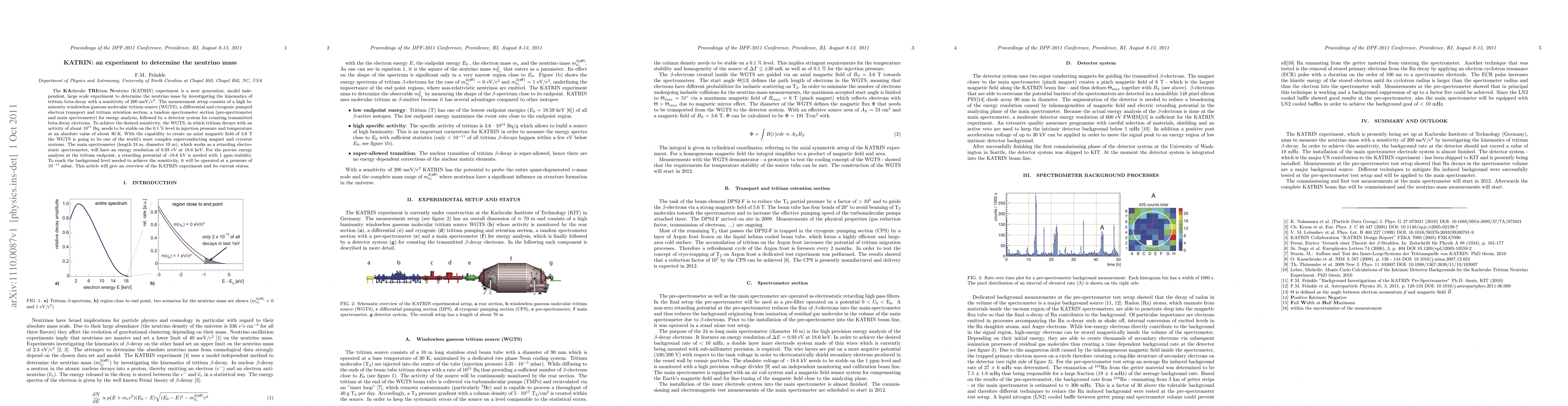 The KATRIN experiment aims to determine neutrino mass by analyzing tritium beta-decay kinematics with a sensitivity of 200 meV/c². It employs a complex setup including a high-luminosity gaseous tritium source, a tandem spectrometer, and a magnetic field system to achieve the required precision.