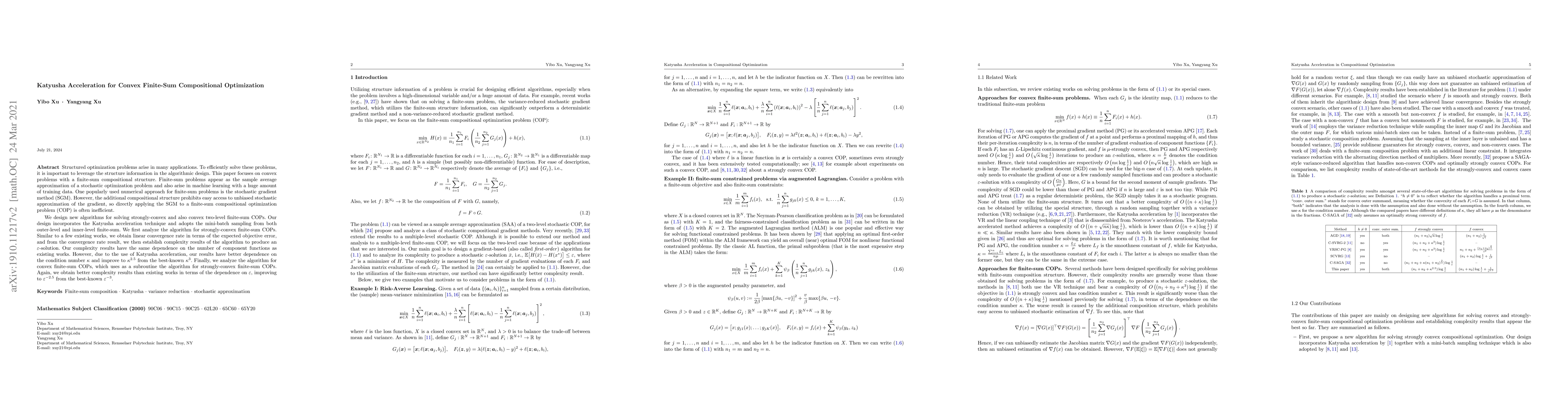 Structured problems arise in many applications. To solve these problems, it is important to leverage the structure information. This paper focuses on convex problems with a finite-sum compositional structure. Finite-sum problems appear as the sample average approximation of a stochastic optimization problem and also arise in machine learning with a huge amount of training data. One popularly used numerical approach for finite-sum problems is the stochastic gradient method (SGM). However, the additional compositional structure prohibits easy access to unbiased stochastic approximation of the gradient, so directly applying the SGM to a finite-sum compositional optimization problem (COP) is often inefficient. We design new algorithms for solving strongly-convex and also convex two-level finite-sum COPs. Our design incorporates the Katyusha acceleration technique and adopts the mini-batch sampling from both outer-level and inner-level finite-sum. We first analyze the algorithm for strongly-convex finite-sum COPs. Similar to a few existing works, we obtain linear convergence rate in terms of the expected objective error, and from the convergence rate result, we then establish complexity results of the algorithm to produce an $\varepsilon$-solution. Our complexity results have the same dependence on the number of component functions as existing works. However, due to the use of Katyusha acceleration, our results have better dependence on the condition number $\kappa$ and improve to $\kappa^{2.5}$ from the best-known $\kappa^3$. Finally, we analyze the algorithm for convex finite-sum COPs, which uses as a subroutine the algorithm for strongly-convex finite-sum COPs. Again, we obtain better complexity results than existing works in terms of the dependence on $\varepsilon$, improving to $\varepsilon^{-2.5}$ from the best-known $\varepsilon^{-3}$.