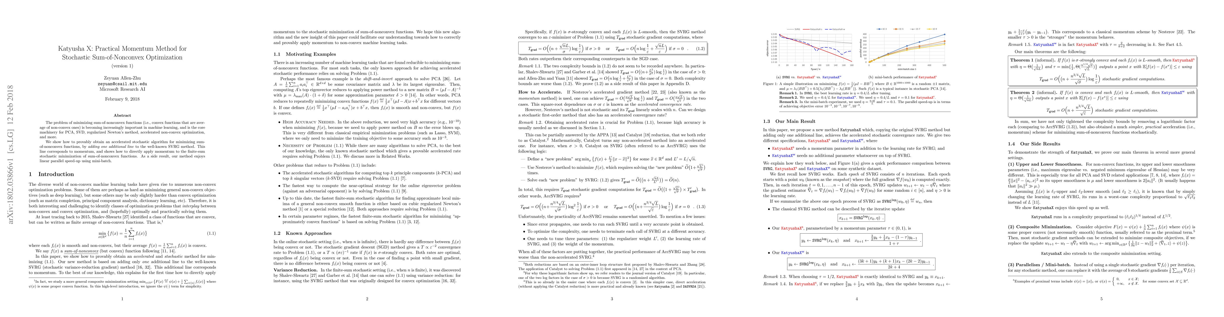 This paper introduces an accelerated stochastic optimization method called Katyusha X, which enhances the SVRG method by adding a momentum line to handle sum-of-nonconvex optimization problems. The method achieves linear parallel speed-up using mini-batches and is applicable to various optimization techniques in machine learning.