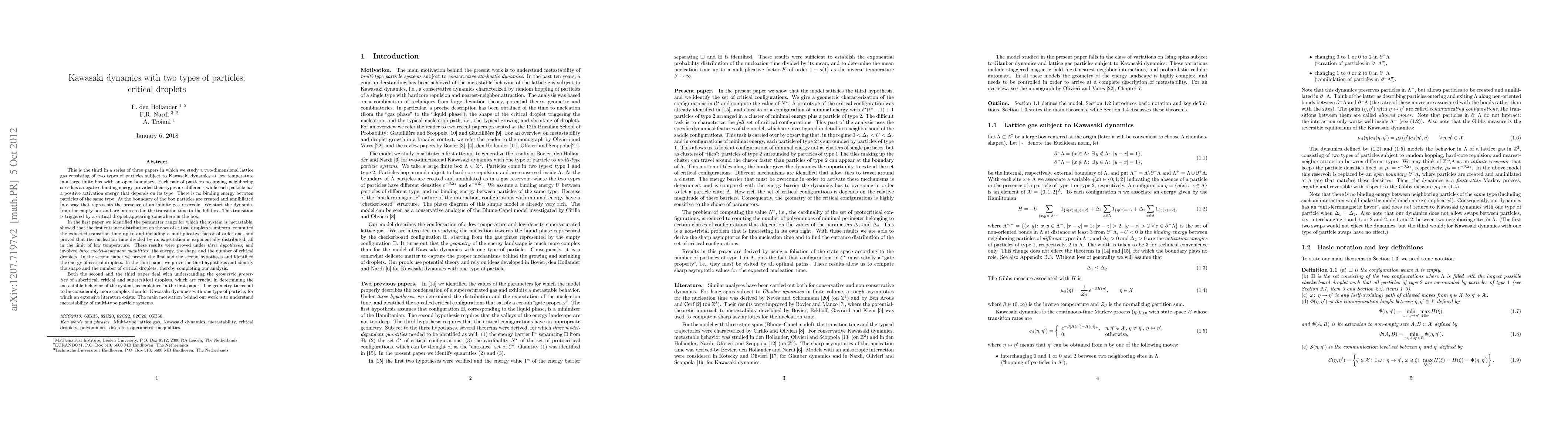 This paper identifies the shape and number of critical droplets in a two-dimensional lattice gas with two particle types, governed by Kawasaki dynamics, and proves the third hypothesis regarding metastability. The study reveals more complex geometric properties compared to single-type particle systems, aiming to better understand the metastable behavior of multi-type particle systems.