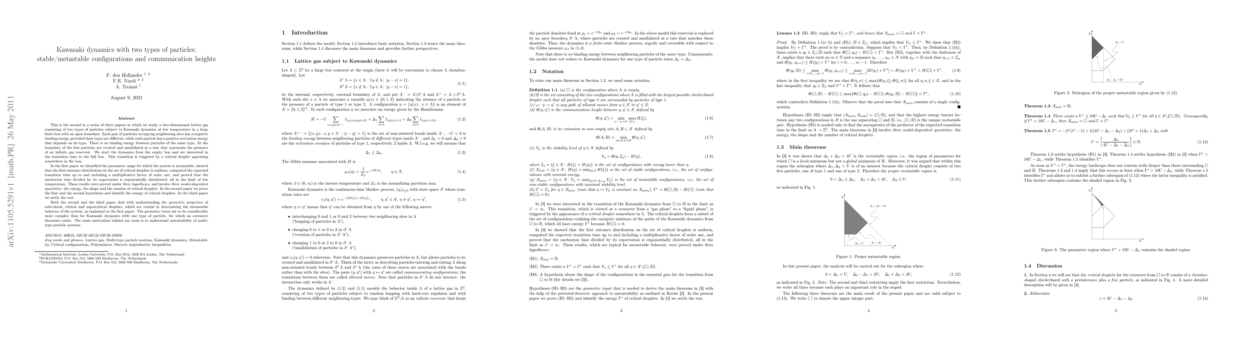 The work introduces a detailed analysis of communication heights and stable/metastable configurations in a two-type Kawasaki dynamics model, providing new insights into the geometric properties and transition behavior of such systems.