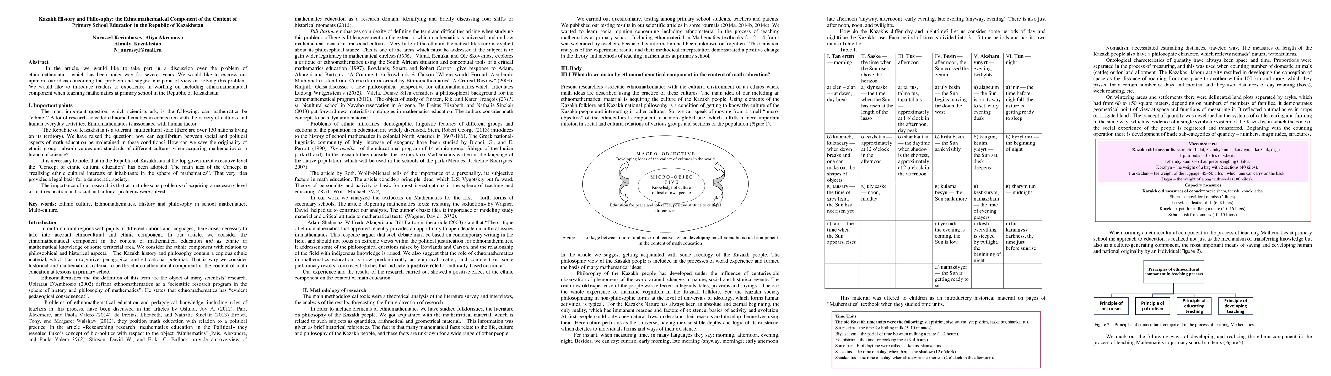 In the article, we would like to take part in a discussion over the problem of ethnomathematics, which has been under way for several years. We would like to express our opinion, our ideas concerning this problem and suggest our point of view on solving this problem. We would like to introduce readers to experience in working on including ethnomathematical component when teaching mathematics at primary school in the Republic of Kazakhstan.