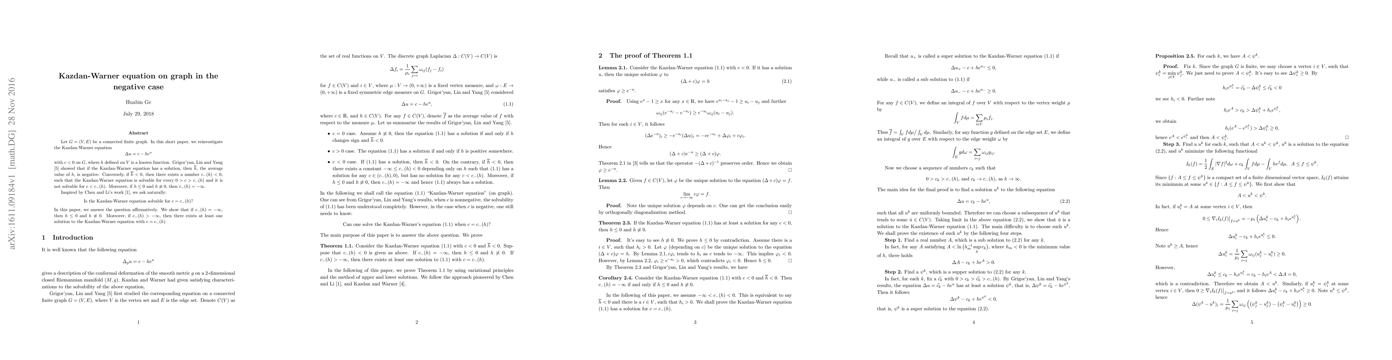 reinvestigate the Kazdan-Warner equation $$\Delta u=c-he^u$$ with $c<0$ on $G$,