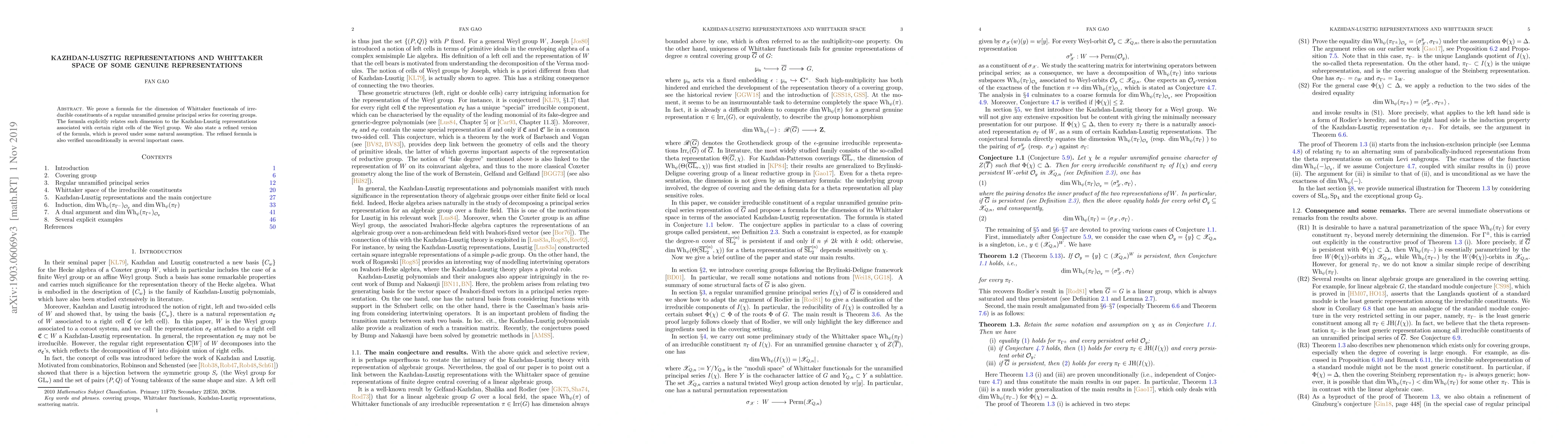 We prove a formula for the dimension of Whittaker functionals of irreducible constituents of a regular unramified genuine principal series for covering groups. The formula explicitly relates such dimension to the Kazhdan-Lusztig representations associated with certain right cells of the Weyl group. We also state a refined version of the formula, which is proved under some natural assumption. The refined formula is also verified unconditionally in several important cases.